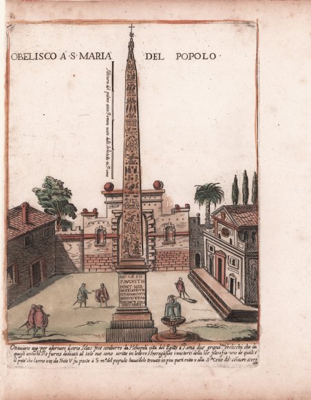 Tavola tratta dalla Nova Racolta degl’Obelischi et Colonne Antiche, della Alma Citta di Roma, con le sue Dichiaratione date in Luce da G. G. Rossi stampata a Roma verso il 1651. Rara edizione, accresciuta, di una serie non datata di 17 tavole raffiguranti gli obelischi e le antiche colonne di Roma; ogni incisione è integrata da una didascalia descrittiva e la maggior parte con una scala o un'indicazione dell'altezza. Questa collezione molto mirata, probabilmente ispirata durante il pontificato di Innocenzo X (Camillo Pamphili, regnante nel 1644-55), venne implementata con una lastra di Louis Rouhier che mostra l'obelisco Pamphili in cima alla fontana dei Quattro Fiumi del Bernini a Piazza Navona. L'impiego degli antichi obelischi come fulcro della notevole trasformazione dell'architettura di Roma durante il periodo barocco è stato ben documentato dagli storici dell'architettura. A partire dagli ultimi decenni del XVI secolo, in uno sforzo grandioso per dimostrare il nuovo spirito dinamico della Controriforma, Sisto V [regnante 1585-90] spostò l'Obelisco Vaticano in Piazza S. Pietro e riedificò quelli che ora si trovano in Piazza del Popolo, Piazza dell'Esquilino e di fronte al Laterano. Il suo esempio fu seguito da molti dei suoi successori nel corso del XVII secolo. Acquaforte, finemente colorata a mano, in ottimo stato di conservazione. Plate from the Nova Racolta degl’Obelischi et Colonne Antiche, della Alma Citta di Roma, con le sue Dichiaratione date in Luce da G. G. Rossi printed in Rome about 1651. Rare edition, enlarged, of an undated series of 17 plates depicting the obelisks and ancient columns of Rome; each engraving is supplemented by a descriptive caption and most with a scale or height indication. This very focused collection, probably inspired during the pontificate of Innocent X (Camillo Pamphili, reigned 1644-55), was implemented with a plate by Louis Rouhier showing the Pamphili obelisk atop Bernini's Quattro Fiumi fountain in Piazza Navona. The use of ancient obelisks as the centerpiece of the remarkable transformation of Rome's architecture during the Baroque period has been well documented by architectural historians. Beginning in the last decades of the 16th century, in a grandiose effort to demonstrate the new dynamic spirit of the Counter-Reformation, Sixtus V [reigned 1585-90] moved the Vatican Obelisk to St. Peter's Square and rebuilt those now located in Piazza del Popolo, Piazza dell'Esquilino, and in front of the Lateran. His example was followed by many of his successors during the 17th century. Etching, finely hand-colored, in excellent condition. Cfr.