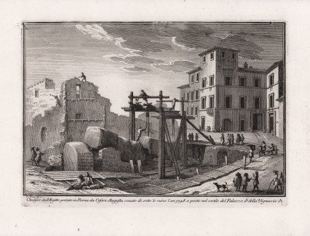 .cavato di sotto le ruine l'an. 1748 e posto nel cortile del Palazzo d.o della Vignaccia. A. ' Largo dell’Impresa, con l’obelisco rotto in cinque pezzi, che venne definitivamente scoperto nel 1748, durante il pontificato di Benedetto XIV Lambertini (1740-1758). Come mostra l’incisione, la posizione dell’obelisco era di fronte al “Palazzo della Vignaccia”, cioè Palazzo Conti, indicato dal Vasi con la lettera A (freccia rossa). Qualche anno dopo, i pezzi dell’obelisco furono portati nel cortile di Palazzo Conti, finché, nel 1792, papa Pio VI Braschi (1775-1799), lo fece finalmente innalzare di fronte alla Curia Innocenziana (palazzo Montecitorio). Largo dell’Impresa e via dell’Impresa prendono il nome dall’Impresa del Lotto, gestita dalla Camera Apostolica, che aveva la sua sede nel Palazzo Conti. ' "In cinque pezzi, e 14. palmi sotto terra fu disotterrato quell'insigne, e smisurato trofeo della Romana potenza l'an. 1748. come si vede riposto nel cortile del vicino palazzo, che dicesi della Vignaccia. E' questo di granito rosso con cifre, o simboli egizj, fatto dal Re Sesostri, e fu condotto a Roma da Ottaviano Augusto dopo aver conquistato l'Egitto, il quale poi lo pose nel campo Marzio, per dimorare colla sua ombra le ore, o la meridiana al popolo Romano, che ivi concorreva a celebrare le feste, e giuochi ne' tempi destinati." (Giuseppe Vasi, Itinerario Istruttivo, 1761) Veduta tratta dalla monumentale opera ' Delle magnificenze di Roma antica e moderna. Pubblicata in 10 volumi dal 1747 al 1761, l’opera presenta 238 incisioni in rame, ciascuna incisione con testo narrativo che fornisce informazioni storiche e documentarie. ' Conosciuto dai più semplicemente come il "maestro" di Giovanni Battista Piranesi, Giuseppe Vasi rivela in quest'opera monumentale la pienezza della sua creatività grafica. I 10 libri che la compongono hanno ognuno un frontespizio con titolo e data diversi: ' Libro primo che contiene le porte e mura; Libro secondo, che contiene le piazze principali di Roma con obelischi, colonne, ed altri ornamenti; Libro terzo, che contiene le basiliche e chiese antiche di Roma; Libro quarto che contiene i palazzi e le vie più celebri; Libro quinto che contiene i ponti e gli edifizj sul Libro sesto che contiene la chiese parrocchiali; Libro settimo che contiene i conventi e case dei chierici regolari; Libro ottavo che contiene i monasteri e conservatorj di donne; Libro nono che contiene i collegj, spedali, e luoghi pii; decimo che contiene le ville e giardini più rimarchevoli. Le ' Magnificenze ' forniscono un panorama completo e al tempo stesso anticonvenzionale dell'Urbe: così, insieme alle consuete, celeberrime inquadrature desunte dalla migliore tradizione vedutistica, si trova anche una Roma insolita, quella che, talvolta, non esiste più. A quest'opera, di centrale importanza nell'editoria romana di metà Settecento, l'Autore aveva lavorato per quasi un ventennio realizzando una monumentale guida dell'Urbe dove accanto alle consuete e celeberrime inquadrature tratte dalla migliore tradizione vedutistica, immortala anche scorci insoliti che sono poi scomparsi con il cambiare della città. Il testo che accompagna le vedute nel primo volume è opera di Giuseppe Bianchini, nel secondo di Orazio Orlandi e nei restanti del Vasi stesso. ' Acquaforte, in ottimo stato di conservazione. ' .cavato di sotto le ruine l'an. 1748 e posto nel cortile del Palazzo d.o della Vignaccia. A. ' This obelisk was excavated in 1748 when some small houses behind ' Palazzo di Montecitorio ' had to be pulled down to make room for a building belonging to the Augustinians; its existence was known since the end of the XVth century. The obelisk was found broken into five major pieces, but parts of it were missing or were damaged by thermal stress caused by fire. The plate shows the machinery built to raise the blocks and a sort of track to move them; one of the blocks shows the dedicatory inscription dictated by ' Emperor Augustus ' ; the plate shows also the buildings which were being pulled down (left) and Palazzo della Vignaccia (right), in the courtyard of which the broken obelisk was temporarily moved. View taken from the monumental work ' Delle magnificenze di Roma antica e moderna. ' Published in 10 volumes from 1747 to 1761, the work features 238 copper engravings, each engraving with a narrative text that provides historical and documentary information. Known by most simply as the "master" of Giovanni Battista Piranesi, Giuseppe Vasi reveals in this monumental work the fullness of his graphic creativity. The 10 books that compose it each have a title page with a different title and date: ' Libro primo che contiene le porte e mura; Libro secondo, che contiene le piazze principali di Roma con obelischi, colonne, ed altri ornamenti; Libro terzo, che contiene le basiliche e chiese antiche di Roma; Libro quarto che contiene i palazzi e le vie più celebri; Libro quinto che contiene i ponti e gli edifizj sul Libro sesto che contiene la chiese parrocchiali; Libro settimo che contiene i conventi e case dei chierici regolari; Libro ottavo che contiene i monasteri e conservatorj di donne; Libro nono che contiene i collegj, spedali, e luoghi pii; decimo che contiene le ville e giardini più rimarchevoli. ' The ' Magnificences ' provide a complete and at the same time unconventional panorama of the City: thus, together with the usual, celebrated shots taken from the best tradition of ' vedutistica, one also finds an unusual Rome, one that, at times, no longer exists. The author had worked on this work, of central importance in Roman publishing in the middle of the eighteenth century, for almost twenty years, producing a monumental guide to the “Urbe” where, alongside the usual and famous shots taken from the best tradition of ' vedutistica, he also immortalized unusual views that have since disappeared with the change of the city. The text that accompanies the views in the first v