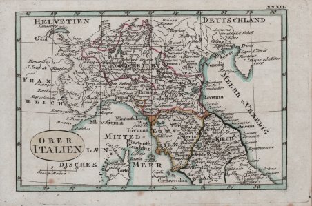 Piccola carta dell'Italia Settentrionale stampata a Weimar all'inizio del XIX secolo. Acquaforte, coloritura editoriale, in ottimo stato di conservazione. Rara. Piccola carta dell'Italia Settentrionale stampata a Weimar all'inizio del XIX secolo. Acquaforte, coloritura editoriale, in ottimo stato di conservazione. Rara. Cfr.
