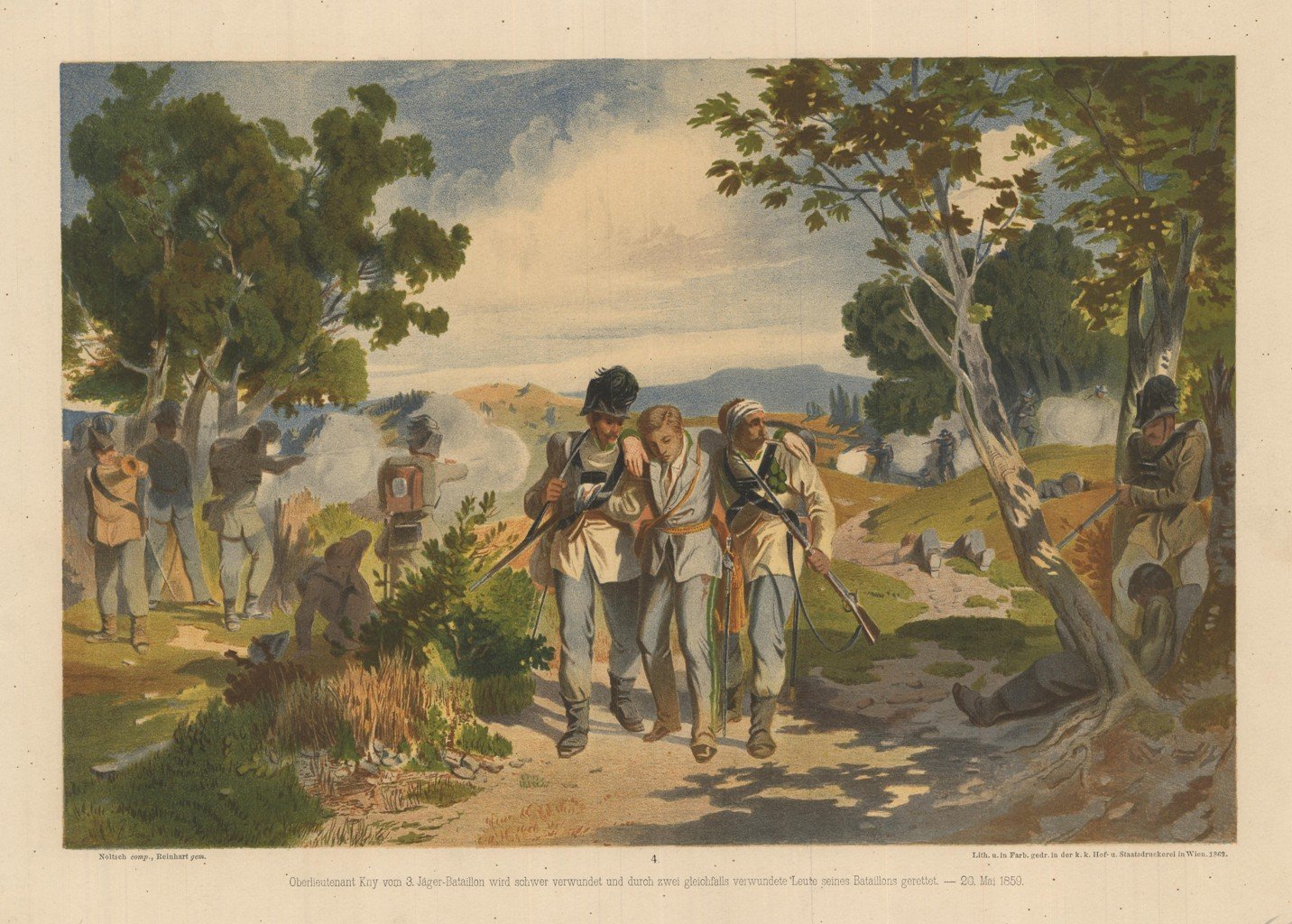 Stampa, antica ed originale, raffigurante una scena della battaglia di Montebello il 28 maggio 1859. Inserita nell'opera "Heldenzüge aus dem Jahre 1859" edita a Vienna nel 1862