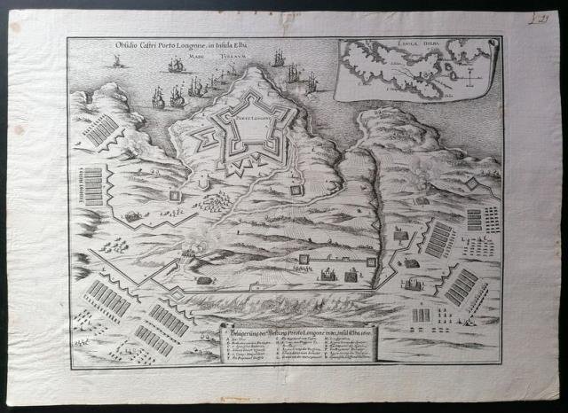 Incisione in rame all'acquaforte, b/n, cm 29,5 x 38,5 (alla lastra) più margini. Veduta a volo d'uccello dell'assedio spagnolo alla cittadina di Porto Longone, bene si distinguono gli schieramenti. In alto a ds., entro stendardo, una piccola carta geografica dell'isola. Alcune piccole macchie marginali, buona impressione e ampi margini. .