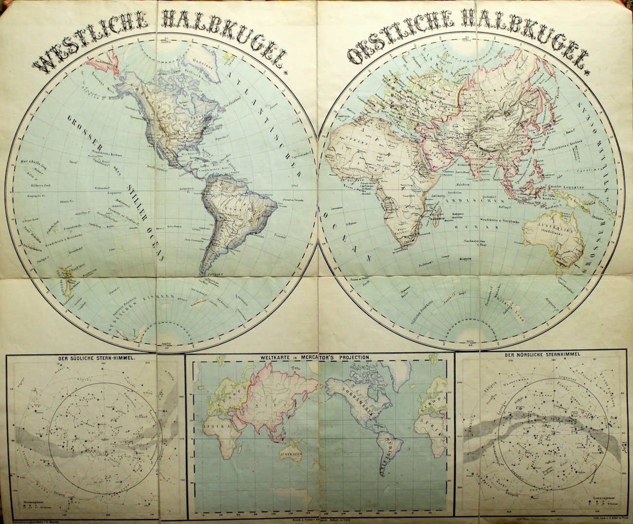 Litografia a colori, stampata da Eduard Hölzel, mm 1080x1290. Montata su tela coeva e ripiegata. Mappa murale che raffigura i due emisferi terrestri in grande, mentre in piccolo ai lati sono rappresentati i die emisferi celesti e il mappamondo in proiezione di Mercatore al centro. Perfettamente conservato. <BR>