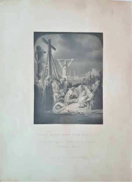 Stampa antica tratta da un dipinto di Rembrandt con la deposizione di Cristo dalla croce. L'incisione riporta nella parte inferiore le indicazioni dell' autore del dipinto dal quale è stata tratta e quelle dell'editore.