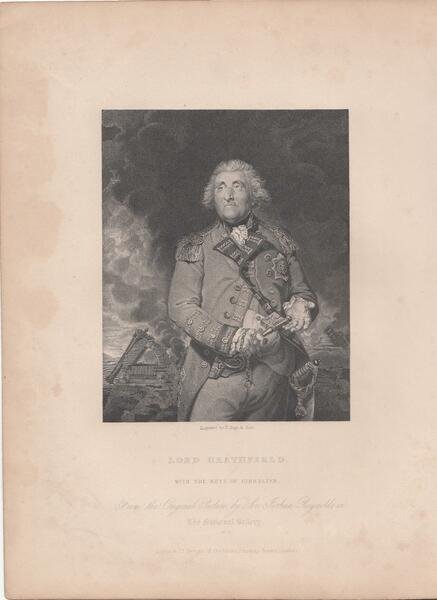 Bella stampa antica tratta da un dipinto di Joshua Reynolds con ritratto di Lord Heathfield in divisa, con decorazioni, la spada e la chiave.