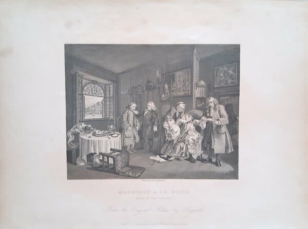 Stampa antica tratta da un dipinto di William Hogarth Matrimonio a la mode il contratto, Marriage a la mode The contract.