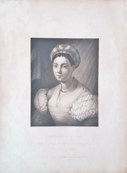 Stampa antica tratta da un dipinto di Agnolo Bronzino con ritratto di una gentildonna fiorentina. L'incisione riporta nella parte inferiore le indicazioni dell'autore del dipinto dal quale è stata tratta e quelle dell'editore.