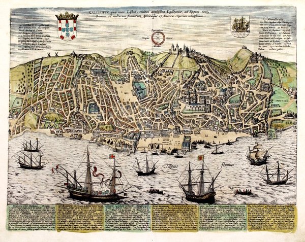 Incisione in rame, colore d'epoca, mm 365x465. Fascinosa veduta prospettica della capitale lusitana colta dal mare a volo d'uccello. Tratta da "Civitates Orbis Terrarum", pietra miliare del vedutismo, stampata dal 1572 al 1617 in 6 volumi pubblicati in anni differenti in varie lingue, compilata e scritta da Georg Braun, mentre Frans Hogenberg fu autore delle incisioni insieme a Simon Novellanus, generalmente da soggetti di Georg Hoefnagel. Ottimo esemplare in bella coloritura antica<BR>------------------------------<BR>Copper engraving, original color, mm 365x465. Fascinating bird-eye view, showing Lisbon from the sea. From "Civitates Orbis Terrarum". Braun gathered together vast amounts of information and draft plans to produce over 500 city views/maps published in six parts between 1572 and 1617.<BR>Most of these engravings were made by Simon Novellanus and Frans Hogenberg, many after drawings by Georg Hoefnagel. Very good example. <BR>