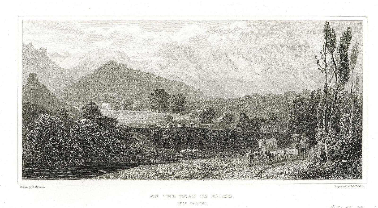 Stampa, antica ed originale, con veduta di un tratto della strada, in direzione di Palco. Autore: Dewint P. Luogo: Palco- Sicilia. Anno: 1821-23. Tecnica: incisione in acciaio. Dimensioni: 105x221. Tratta dall'opera " Sicilian Scenery" Pubblicata da Rodwel & Martin a Londra nel 1821 in fascicoli e nel 1823 in unica pubblicazione