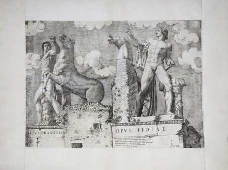 Bulino, 1546, firmato e datato in basso a destra: ROMAE ? D XLVI / ANT LAFRERI SEQVANI FORMIS. Iscritto in basso a destra: «HEVS TV QVI PRAETERIS MORARE PAVLVM AC INSPICE · IN QVIRINALI HI SVNT EQVI MARMOREI MVTILI ATQ[VE] GRANDES · ARTE VICTA NATVRA PARENS SPIRITVM CVR ERIPIT · QVID PRAXITELES ET FIDIAS EFFINXERE ISTOS AEMVLAMVR · SAT DIXI ABEL VALE SALVE MISCE BIBE DA MI» [Ehi!, tu che passi. Fermati un po’ e guarda. Al Quirinale ci sono questi cavalli di marmo, mutili, di grandi dimensioni. - Vinta dall’arte, perché madre natura rapisce lo spirito? Quello che Prassitele e Fidia scolpirono, noi emuliamo. Ho detto abbastanza, Abele: ave, salve, mesci, bevi, e offrine [anche] a me]. Iscritto sui piedistalli dei dioscuri: OPVS PRAXITELIS - OPVS FIDIAE. Esemplare nel primo stato di tre per Rubach, secondo di quattro per Alberti che descrive una prova ante la firma del Lafreri conservata nella raccolta della Marucelliana a Firenze. Magnifica prova, ricca di toni impressa su carta vergata coeva con filigrana “Cervo in uno scudo con croce” (cfr. Woodward nn. 51-52), rifilata al rame e con margini coevi aggiunti, in ottimo stato di conservazione. “L’incisione mostra il cattivo stato di conservazione in cui erano i due colossi prima dei restauri voluti da Sisto V (1585-1590). Manca l’obelisco, recuperato dal Mausoleo di Augusto, che sarà inserito tra i due gruppi marmorei nel 1786 da Carlo Antinori, per volontà di Pio VI (1775- 1799). L’appellativo di Dioscuri si deve al Perrier che nella sua opera sulle statue più ammirate di Roma riportava le discordanti interpretazioni sui due colossi: secondo alcuni si sarebbe trattato di Alessandro e Bucefalo in duplice replica (come ritengono gli incisori di queste stampe cinquecentesche), secondo altri di Castore e Polluce e, infine, dei Dioscuri. La denominazione di Monte Cavallo data al colle del Quirinale deriva dai due grandi cavalli del gruppo scultoreo. […] Le statue sono copie romane del II-III secolo di originali greci del V sec. a.C. credute per tanto tempo copie di opere di artisti famosi tanto che sulle base è riportata la scritta “Opus Fidiae” e “Opus Praxitelis” e rappresentano i Dioscuri, i mitologici cavalieri figli di Giove che salvarono l’esercito romano al Lago Regillo. Sin dal Medioevo tutti i visitatori di Roma hanno potuto ammirarle nello stesso luogo dove sono ancora oggi e proprio per la loro presenza il Quirinale venne chiamato Montecavallo. La posizione in cui si trovano oggi è quella progettata da Flaminio Vacca per Sisto V, integrata dalle modifiche apportate nel 1783 da Carlo Antinori per Pio VI. Papa Sisto V voleva creare una mostra adeguata per il castello terminale dell’Acqua Virgo e pensò di utilizzare le due statue gigantesche che già si trovavano sulla piazza ed erano poste di fronte al Palazzo Vercelli o della Consulta; volle far girare le statue in modo che chiudessero visivamente lo scenario della Strada Pia – odierna Via XX Settembre – ed affidò l’incarico a Domenico Fontana che arretrò le statue e le mise in posizione frontale al Palazzo del Quirinale e vi pose una fontana davanti. L’ultimo spostamento delle statue fu voluto da Papa Pio VI che fece innalzare tra i due gruppi marmorei l’obelisco che si trovava nel Mausoleo di Augusto; i due gruppi furono divaricati per lasciar posto all’obelisco e davanti fu posta una vasca di granito che proveniva dal Campo Vaccino a raccogliere l’acqua che ricadeva dallo zampillo dell’Acqua Virgo. Dell’incisione vi è un altro esemplare in controparte edito per i tipi di Antonio Salamanca” (cfr. Marigliani, ' Lo splendore di Roma nell’Arte incisoria del Cinquecento). L’opera appartiene allo ' Speculum Romanae Magnificentiae, la prima iconografia della Roma antica. Le lastre figurano nell'Indice del Lafreri al n. 230, descritta come ' Caualli di Praxitelle et Fidia di forma dinanti et di retro separati sono nel monte Quirinale detto monte Ca. Engraving, 1546, signed and dated lower right: ROMAE ? D XLVI / ANT LAFRERI SEQVANI FORMIS. Inscribed at lower right: "HEVS TV QVI PRAETERIS MORARE PAVLVM AC INSPICE - IN QVIRINALI HI SVNT EQVI MARMOREI MVTILI ATQ[VE] GRANDES - ARTE VICTA NATVRA PARENS SPIRITVM CVR ERIPIT - QVID PRAXITELES ET FIDIAS EFFINXERE ISTOS AEMVLAMVR - SAT DIXI ABEL VALE SALVE MISCE BIBE DA MI" [Hey! you passing by. Stop a little and look. At the Quirinal there are these marble horses, mutilated, large. - Won by art, why does mother nature rapture the spirit? What Praxiteles and Phidias sculpted, we emulate. I have said enough, Abel: hail, hail, mix, drink, and offer it [also] to me]. Inscribed on the pedestals of the dioscuri: OPVS PRAXITELIS - OPVS FIDIAE. Example in the first state of three for Rubach, second of four for Alberti describing a proof before Lafreri's signature preserved in the Marucelliana collection in Florence. Magnificent proof, richly toned impressed on contemporary laid paper with watermark "Deer in a shield with cross" (cf. Woodward nos. 51-52), trimmed to copperplate and with coeval margins added, in excellent condition. “The engraving shows the poor state of conservation in which the two giants were before the restoration commissioned by Sixtus V (1585-1590). The obelisk is missing, recovered from the Mausoleum of Augustus, which was inserted between the two marble groups in 1786 by Carlo Antinori, at the behest of Pius VI (1775-1799). The name of Dioscuri is due to Perrier who in his work on the most admired statues of Rome reported the discordant interpretations of the two giants: according to some it was Alexander and Bucephalus in double replica (as the engravers of these sixteenth-century prints believe), according to others of Castor and Pollux and, finally, of the Dioscuri (see cards cat. V.36, V.37). The name of Monte Cavallo given to the Quirinale hill derives from the two great horses of the sculpture group. The statues are Roman copies of 2nd-3rd century Greek ori