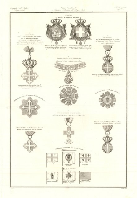 Tavola raffigurante gli stemmi della R. Casa di Savoia, le decorazioni e le bandiere marittime del Regno Sardo