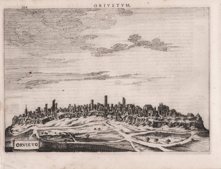 Veduta tratta dal ' Nova et accurata Italiae hodiernae descriptio in qua omnium eius regionum, vrbium, pagorum, dominiorum, castellorum, montium, fluviorum, fontium, lacuum, et portuum, historia exhibetur. Geographicis tabulis et vrbium praecipuarum iconibus illustrata a Iudoco Hondio addita est Siciliae, Sardiniae, Corsicae, et itinerariorum per Italiam brevis delineatio, stampato a Leida dalla tipografia Elzevir nel 1627. Si tratta di un atlante geografico unito ad una raccolta di cartografia urbana, esclusivamente dedicato alla penisola. ' ' L’opera consta di 31 carte geografiche e 67 vedute o piante di città. Le carte derivano dall’Atlas Minor ' del Mercator, mentre la cartografia urbana è basata sui modelli introdotti a Venezia da Francesco Valegio e da quelli del ' Civitates Orbis Terrarum ' di G.Braun e F. Hogenberg. L’opera è relativa al periodo in cui Jodocus Hondius II si era appena diviso dal fratello Hendrick. Secondo la letteratura esisterebbe una prima edizione della raccolta, stampata ad Amsterdam nel 1626. Jodocus Hondius Jr. nacque nel 1593, e la sua prima pubblicazione firmata fu una mappa della Scandinavia, pubblicata nel 1613. Figlio di Jodocus Hondius (1563-1612) - incisore, cartografo, stampatore ed editore – che fu il fondatore della tipografia Hondius, una delle più importanti dell'epoca. Con la morte - nel 1612 - ' ' di Jodocus senior, la vedova Coletta van den Keere continuò l'attività con i suoi due figli; Jodocus Jr. e Hendrick (1597-1651) ne presero il posto. Nel giugno 1621, Jodocus Jr. sposò Anne Staffmaecker, e si trasferì in un negozio sulla Diga, dove stabilì la propria attività editoriale. Secondo Peter van the Krogt (cfr. ' Atlantes Neerlandici) Jodocus Hondius Jr. e suo fratello minore Hendrick, erano concorrenti. Acquaforte, in buono stato di conservazione. ' Bibliografia Alberto Satolli, Imago VV, Le rappresentazioni della città di Orvieto dalle origini ad oggi, p. 139, tav. XLVIII; ' Cremonini, pp. 23/25; Fossati Bellani; n. 320; Willems; n. 279. ' View taken ' from Nova et accurata Italiae hodiernae descriptio in qua omnium eius regionum, vrbium, pagorum, dominiorum, castellorum, montium, fluviorum, fontium, lacuum, et portuum, historia exhibetur. Geographicis tabulis et vrbium praecipuarum iconibus illustrata a Iudoco Hondio addita est Siciliae, Sardiniae, Corsicae, et itinerariorum per Italiam brevis delineatio, printed in Leiden by the printing house Elzevir in 1627. This is a geographical atlas combined with a town book, exclusively dedicated to Italy. ' ' The work consists of 31 maps and 67 views or plans of cities. The maps derive from Mercator's ' Atlas Minor, ' while the plans are based on the models introduced in Venice by Francesco Valegio and those of ' Civitates Orbis Terrarum ' by G. Braun and F. Hogenberg. The work is related to the period in which Jodocus Hondius II had just separated from his brother Hendrick. According to the literature there is a first edition of the collection, printed in Amsterdam in 1626. Jodocus Hondius Jr. was born in 1593, and his first signed publication was a map of Scandinavia, published in 1613. He was the son of Jodocus Hondius (1563-1612) - engraver, cartographer, printer and publisher - who was the founder of the Hondius printing house, one of the most important of the time. With the death - in 1612 - of Jodocus senior, his widow Coletta van den Keere continued the business with her two sons; Jodocus Jr. and Hendrick (1597-1651) took his place. In June 1621, Jodocus Jr. married Anne Staffmaecker and moved to a shop on the Dyke, where he established his publishing business. According to Peter van the Krogt (see ' Atlantes Neerlandici) Jodocus Hondius Jr. and his younger brother Hendrick were competitors. Copper engraving, in good condition. Bibliografia Alberto Satolli, Imago VV, Le rappresentazioni della città di Orvieto dalle origini ad oggi, p. 139, tav. XLVIII; ' Cremonini, pp. 23/25; Fossati Bellani; n. 320; Willems; n. 279. ' Cfr.