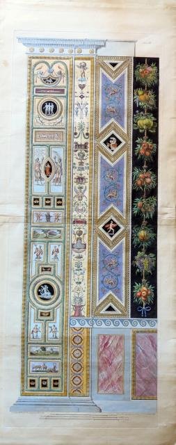 Incisione in rame a all’acquaforte e bulino, 1774 – 1776 circa, firmata in basso in lastra, cm 50,5 x 120 circa (il foglio), recente ma bella coloritura. Prova impressa su carta vergata coeva con filigrana “scudo con giglio” (di quelle di cui disponiamo ove presente), ampi margini, buono lo stato di conservazione. La serie degli "Ornati delle Logge di Raffaello nel Vaticano", ossia la riproduzione completa a stampa delle pitture dei pilastri delle Logge Vaticane ideate e affrescate da Raffaello, comprendente quarantasei tavole, fu realizzata nella sua interezza tra il 1760 e il 1777 e reca i nomi di Giovanni Volpato e di Giovanni Ottaviani (una seconda edizione sarebbe stata terminata nel 1782). Conobbe un lavoro lungo e travagliato, giustificato dall’enorme mole di lavoro. Le incisioni uscirono, per la prima parte, in tre volumi, tra il 1768 - 69 e il 1772, frutto della collaborazione fra i disegni del pittore Gaetano Savorelli (notizie seconda metà del sec. XVIII) e quelli dell'architetto Pietro Camporesi (1747 – 1831) con il lavoro di incisione di Giovanni Ottaviani (1735 ca. - 1808). Nella parte inferiore dei bulini appare un'iscrizione che riporta il nome dell'incisore, dei due disegnatori e il privilegio papale di Clemente XIII, apposto su ogni lastra incisa compresa nella prima serie, che posiziona l'esecuzione della matrice entro il 1769, data della morte del pontefice. Dal 1772 – 1774, si aggiunsero il disegnatore Ludovico Teseo (1731 – 1782) e l'incisore Giovanni Volpato (1740 – 1803). Volpato incise la matrice su disegno di Lodovico Teseo, questi due nomi firmarono le tavole della terza parte raffiguranti i pilastri. Nella parte inferiore dei bulini appare un'iscrizione che riporta il nome dell'incisore, del disegnatore e il privilegio papale di Clemente XIV. L’intervento di Volpato, che assunse in un certo senso la direzione dell’opera, legando il suo nome all’impresa, costituisce il motivo del suo trasferimento a Roma, probabilmente chiamato da Clemente XIV (1769 – 1774). Volpato deve gran parte della sua notorietà, nell’ambiente romano del tempo, a questa prima opera che affronta in modo dettagliato e completo. L'intervento del Volpato, seppur arrivato per ultimo, pare sia stato maggiore, più forte e determinante. Le tavole, incise tra il 1774 e il 1776, riproducono con grandeliberta traduttiva (a differenza della prima serie, dove la leggibilità e la conservazione degli affreschi era assai migliore, permettendo così fedeltà all'originale). Infatti la scarsa visibilità della parte inferiore degli affreschi rispetto alle lunette, spinse l’artista ad applicare integrazioni di fantasia, come nel caso di alcuni pilastri dove sono inseriti elementi decorativi desunti dalle bordure di alcuni arazzi vaticani. La raccolta ebbe vastissima risonanza e rappresentò una delle operazioni di riproduzione più impegnative, venendo a costituire un importante repertorio figurativo da cui attingere motivi di decorazione e contribuendo al grande successo dei temi grotteschi del periodo neoclassico (non dimentichiamo la grande influenza esercitata dalle importanti scoperte di Pompei e di Ercolano nella prima metà del Settecento). La decorazione di Raffaello per la galleria coperta che portava al Palazzo del Papa fu percepita subito come un'opera esemplare di decorazione all'antica e il successo fu tale da indurre amatori d'arte a commissionare disegni fedeli delle pitture raffaellesche. Questa raccolta di Ottaviani e Volpato, fu la prima raccolta organica di incisioni relative all'opera raffaellesca e grazie ad essa si poté disporre dell'intero apparato iconografico delle Logge, tant'é che fu utilizzata come strumento per lo studio delle pitture fino all'avento della fotografia. Il successo dell'opera fu notevole, lo dimostra anche l'elevato numero di tirature che essa conobbe. Sono note delle prove in coloritura coeva (gli esemplari del Quirinale con la collaborazione dello svizzero Du Cros), mentre le prove destinate alla coloritura sono stampate con inchiostro marrone – bistro, dai toni più delicati, più rare. Il set di incisoni viene citato dai principali dizionari (Thieme - Becker, Bénézit) e repertori di catalogazione. Studiato principalmente come unità all'interno della serie, prima da Passavant (1864, p. 170) e successivamente da Ruland nella collezione di Windsor Castle (1876, p. 230, 231 – 237), con la critica moderna sono i singoli fogli a diventare oggetto di studio: Dacos (1986, p. 254, n. VII B), Bernini Pezzini, in "Raphael Invenit" (1985, p. 106, n. XIII. 37), Hoper (2001, p. 479, n. G 21.35). Un'ulteriore riflessione sulle stampe di Volpato viene affrontata da Marini (1988, p. 177, n. 189) e infine da Gilet (2007, p. 176, n. 34), che riporta dati tecnici e bibliografici aggiornati e che correda con un commento stilistico sulla serie.