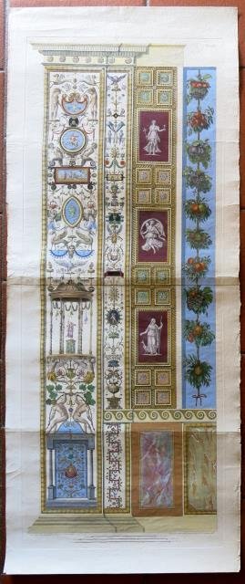 Incisione in rame a all’acquaforte e bulino, 1774 – 1776 circa, firmata in basso in lastra, cm 50,5 x 120 circa (il foglio), recente ma bella coloritura. Prova impressa su carta vergata coeva con filigrana “scudo con giglio” (di quelle di cui disponiamo ove presente), ampi margini, buono lo stato di conservazione. La serie degli "Ornati delle Logge di Raffaello nel Vaticano", ossia la riproduzione completa a stampa delle pitture dei pilastri delle Logge Vaticane ideate e affrescate da Raffaello, comprendente quarantasei tavole, fu realizzata nella sua interezza tra il 1760 e il 1777 e reca i nomi di Giovanni Volpato e di Giovanni Ottaviani (una seconda edizione sarebbe stata terminata nel 1782). Conobbe un lavoro lungo e travagliato, giustificato dall’enorme mole di lavoro. Le incisioni uscirono, per la prima parte, in tre volumi, tra il 1768 - 69 e il 1772, frutto della collaborazione fra i disegni del pittore Gaetano Savorelli (notizie seconda metà del sec. XVIII) e quelli dell'architetto Pietro Camporesi (1747 – 1831) con il lavoro di incisione di Giovanni Ottaviani (1735 ca. - 1808). Nella parte inferiore dei bulini appare un'iscrizione che riporta il nome dell'incisore, dei due disegnatori e il privilegio papale di Clemente XIII, apposto su ogni lastra incisa compresa nella prima serie, che posiziona l'esecuzione della matrice entro il 1769, data della morte del pontefice. Dal 1772 – 1774, si aggiunsero il disegnatore Ludovico Teseo (1731 – 1782) e l'incisore Giovanni Volpato (1740 – 1803). Volpato incise la matrice su disegno di Lodovico Teseo, questi due nomi firmarono le tavole della terza parte raffiguranti i pilastri. Nella parte inferiore dei bulini appare un'iscrizione che riporta il nome dell'incisore, del disegnatore e il privilegio papale di Clemente XIV. L’intervento di Volpato, che assunse in un certo senso la direzione dell’opera, legando il suo nome all’impresa, costituisce il motivo del suo trasferimento a Roma, probabilmente chiamato da Clemente XIV (1769 – 1774). Volpato deve gran parte della sua notorietà, nell’ambiente romano del tempo, a questa prima opera che affronta in modo dettagliato e completo. L'intervento del Volpato, seppur arrivato per ultimo, pare sia stato maggiore, più forte e determinante. Le tavole, incise tra il 1774 e il 1776, riproducono con grandeliberta traduttiva (a differenza della prima serie, dove la leggibilità e la conservazione degli affreschi era assai migliore, permettendo così fedeltà all'originale). Infatti la scarsa visibilità della parte inferiore degli affreschi rispetto alle lunette, spinse l’artista ad applicare integrazioni di fantasia, come nel caso di alcuni pilastri dove sono inseriti elementi decorativi desunti dalle bordure di alcuni arazzi vaticani. La raccolta ebbe vastissima risonanza e rappresentò una delle operazioni di riproduzione più impegnative, venendo a costituire un importante repertorio figurativo da cui attingere motivi di decorazione e contribuendo al grande successo dei temi grotteschi del periodo neoclassico (non dimentichiamo la grande influenza esercitata dalle importanti scoperte di Pompei e di Ercolano nella prima metà del Settecento). La decorazione di Raffaello per la galleria coperta che portava al Palazzo del Papa fu percepita subito come un'opera esemplare di decorazione all'antica e il successo fu tale da indurre amatori d'arte a commissionare disegni fedeli delle pitture raffaellesche. Questa raccolta di Ottaviani e Volpato, fu la prima raccolta organica di incisioni relative all'opera raffaellesca e grazie ad essa si poté disporre dell'intero apparato iconografico delle Logge, tant'é che fu utilizzata come strumento per lo studio delle pitture fino all'avento della fotografia. Il successo dell'opera fu notevole, lo dimostra anche l'elevato numero di tirature che essa conobbe. Sono note delle prove in coloritura coeva (gli esemplari del Quirinale con la collaborazione dello svizzero Du Cros), mentre le prove destinate alla coloritura sono stampate con inchiostro marrone – bistro, dai toni più delicati, più rare. Il set di incisoni viene citato dai principali dizionari (Thieme - Becker, Bénézit) e repertori di catalogazione. Studiato principalmente come unità all'interno della serie, prima da Passavant (1864, p. 170) e successivamente da Ruland nella collezione di Windsor Castle (1876, p. 230, 231 – 237), con la critica moderna sono i singoli fogli a diventare oggetto di studio: Dacos (1986, p. 254, n. VII B), Bernini Pezzini, in "Raphael Invenit" (1985, p. 106, n. XIII. 37), Hoper (2001, p. 479, n. G 21.35). Un'ulteriore riflessione sulle stampe di Volpato viene affrontata da Marini (1988, p. 177, n. 189) e infine da Gilet (2007, p. 176, n. 34), che riporta dati tecnici e bibliografici aggiornati e che correda con un commento stilistico sulla serie.