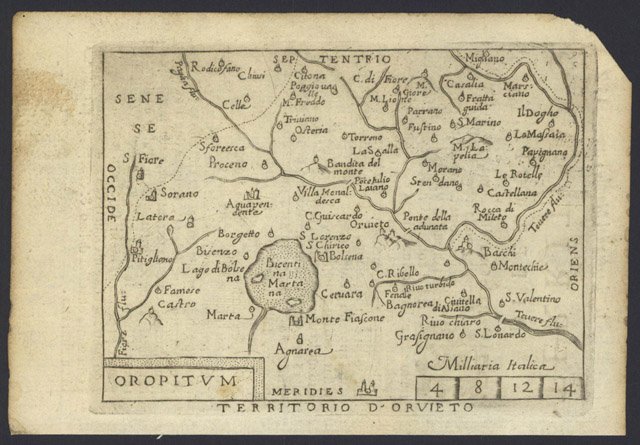 Piccola carta geografica del terriotorio di Orvieto. Tratta dall'opera "Theatro del mondo di Abraamo Ortelio" dedicata all'Illustrissimo Signor Pietro Querini. Edita in Venezia per Scipion Banca MDCLXVII. Margine ridotto all'angolo alto di destra
