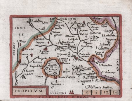 Carta in miniatura preparata per l’edizione italiana dell’Epitome theatri Orteliani, una riduzione delle carte del ' Theatrum Orbis Terrarum ' di Abraham Ortelius, pubblicata per la prima volta ad Anversa da Philip Galle nel 1577 con il titolo di ' Spieghel der werelt ' (Specchio del mondo). Nel 1593, sempre ad Anversa, viene alla luce il ' Theatro del mondo, l’edizione italiana dell’opera curata dal Galle. Nel 1598, Pietro Maria Marchetti, stampa a Brescia il ' Theatro del mondo, edizione “pirata” dell’opera originale del Galle, corredata da 109 mappe fatte incidere copiando le originali. Le carte vengo incise da un anonimo artista e inserite in una pagina di testo in italiano e furono usate anche per illustrare le "Relationi universali di Giovanni Botero", pubblicato sempre in Brescia nel 1599. È nota anche una ristampa delle stesse ' Relationi, pubblicata da Alessandro Vecchi a Venezia nel 1618 e ancora nel "Theatro del mondo" di Giovanni M. Turrini, (1655), e Scipione Banca (1657); queste due ultime edizioni recano il testo descrittivo al verso della carta. Esemplare dall'edizione del 1655 curata da Giovanni M. Turrini. Incisione in rame, finemente colorata a mano, in ottimo stato di conservazione. Rara. Bibliografia G. King, ' Miniature Antique Maps, ' pp. 78-79; ' Alberto Satolli, Imago VV, Le rappresentazioni della città di Orvieto dalle origini ad oggi, p. 126, tav. XXXVIII. Miniature map prepared for the Italian edition of the ' Epitome theatri Orteliani, ' a reduction of the maps of Abraham Ortelius' ' Theatrum Orbis Terrarum, first published in Antwerp by Philip Galle in 1577 under the title ' Spieghel der werelt (Mirror of the World). In 1593, also in Antwerp, the ' Theatro del mondo, ' the Italian edition of the work edited by Galle, came to light. In 1598, Pietro Maria Marchetti, printed in Brescia his ' Theatro del mondo, a "pirate" edition of Galle's original work, accompanied by 109 maps made by copying the originals. The maps were engraved by an anonymous artist and inserted into a page of Italian text and were also used to illustrate Giovanni Botero's "Relationi universali" also published in Brescia in 1599. A reprint of the same ' Relationi ' is also known, published by Alessandro Vecchi in Venice in 1618 and again in Giovanni M. Turrini's "Theatro del mondo" (1655), and Scipione Banca (1657); the latter two editions bear the descriptive text on the verso of the map. Map taken from ' Giovanni M. Turrini's "Theatro del mondo" (1655). Copperplate engraving, in very good condition. Rare. Bibliografia G. King, ' Miniature Antique Maps, ' pp. 78-79; ' Alberto Satolli, Imago VV, Le rappresentazioni della città di Orvieto dalle origini ad oggi, p. 126, tav. XXXVIII. Cfr.