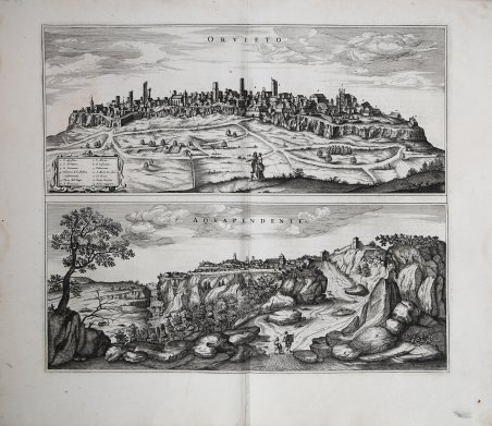 Coppia di vedute prospettiche delle città di Orvieto e Acquapendente, stampate su un foglio tratto dalla rara prima edizione del ' Theatrum Civitatum et Admirandorum Italiae ad aevi veteris & praesentis temporis faciem expressum à Ioanne Blaeu G. F., ' stampata ad Amsterdam nel 1663. Si tratta del primo, monumentale, libro interamente dedicato alla cartografia urbana della sola penisola, preceduto dal “tascabile” ' Italia Hodierna ' di Jodocus Hondius del 1627 e realizzato in probabile concorrenza con Johannes Janssonius che, nel 1657, aveva pubblicato il ' Theatrum praecipuarum urbium, contenente un volume dedicato all’Italia. Johannes Blaeu, durante la sua lunga attività editoriale pubblica tre volumi sulle città italiane. Nel 1663 i primi tre, suddivisi in Stato della Chiesa, Roma e Regno di Napoli e Sicilia. Alla sua morte i suoi eredi danno alla luce altri due volumi datati 1682 incentrati sulle città del Piemonte e della Savoia, poi ristampati da altri editori nel 1693 e 1697. Il francese Pierre Mortier pubblica una ristampa nel 1704/5, intitolata ' Nouveau Theatre de l’Italie. ' L’opera è in quattro volumi e comprende le lastre del Blaeu, ritoccate e modificate in piccola parte, integrate dall’aggiunta di numerose nuove mappe di proprio disegno, raffiguranti le città della parte settentrionale della penisola, racchiuse nel primo volume dell’opera. L’atlante del Mortier venne pubblicato con testo latino, francese ed olandese. Il grande successo dell’opera diede origine ad un’ulteriore ristampa, praticamente identica, curata da Alberts ed edita nel 1724/5. La veduta di acquapendente della città basata sul modello del Pozzoferrato, pubblicato nel Theatrum Civitatum di Braun & Hogenberg del 1598. Quella di Orvieto deriva sempre dal modello ' pubblicato nel ' Theatrum Civitatum ' del 1573. Esemplare con testo descrittivo la verso, della prima edizione del 1663. Bibliografia Koeman, ' Atlas Neerlandici, pp. 332/338; Cremonini pp. 49-52; A. Satolli, Imago VV, Le rappresentazioni della città di Orvieto dalle origini ad oggi, p. 154, n. LIX. ' Views of Orvieto & Acquapendente printed in one sheet, taken form the rare first edition of ' Theatrum Civitatum et Admirandorum Italiae ad aevi veteris & praesentis temporis faciem expressum à Ioanne Blaeu G. F., ' printed by Johannes Blaeu, Amsterdam, 1663. This is the first monumental town book entirely covering Italy, preceded by the "pocket-size" ' Italia Hodierna ' by Jodocus Hondius jr. (1627) and realized in likely competition with Johannes Janssonius who, in 1657, published the ' Theatrum praecipuarum urbium, ' containing a volume dedicated to Italy. Johannes Blaeu, during his long editorial activity published three volumes on Italian cities. In 1663 the first three, divided into the State of the Church, Rome and the Kingdom of Naples and Sicily. At his death his heirs gave birth to two more volumes dated 1682 focused on the cities of Piedmont and Savoy, then reprinted by other publishers in 1693 and 1697. Pierre Mortier publishes a reprint in 1704/5, entitled ' Nouveau Theatre de l'Italie. The work is in four volumes and includes the plates of Blaeu, retouched and modified in small part, supplemented by the addition of several new maps of his own design, depicting the cities of the northern part of the peninsula, enclosed in the first volume of the work. Mortier's atlas was published with Latin, French and Dutch texts. The great success of the work gave rise to a further reprint, virtually identical, edited by R. Alberts and published in 1724/5. Example of the first edition, showing descriptive text on the back of the map. Literature Koeman, ' Atlas Neerlandici, pp. 332/338; Cremonini pp. 49-52. Cfr.