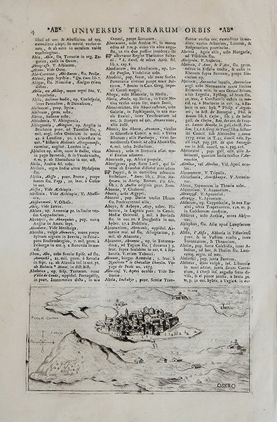 Carta per la prima volta pubblicata nel celebre “Viiaggio da Venezia a Costantinopoli" del Rosaccio, illustrate dalle tavole di Giacomo Franco. Nel 1597 viene stampata la "Descrittione Geografica delle Isole, città e fortezze principali che si trovano in mare nel viaggio da Venetia à Costantinopoli; con molte altre a questo vicine, di nuovo aggiunte. Racolte con molta acuratezza da Giacomo Franco". L’opera reca in calce l’imprint Venetia, Presso il Franco 1597. Nel 1597 chiede e ottiene un privilegio per il volume del medico e geografo di Pordenone GiuseppeRosaccio (1530-1620 circa), “Il viaggio da Venezia a Costantinopoli”, che viene alla luce con il titolo Viaggio da Venetia a Costantinopoli per mare, e per terra, & insieme quello di Terra Santa. Da Gioseppo Rosaccio con brevita descritto. Nel quale, oltre à Settantadui disegni, di geografia, e corografia si discorre, quanto in esso viaggio, si ritrova. Cioe. Citta, Castelli, Porti, Golfi, Isole, Monti, Fiumi, e Mari. Opera utile, à Mercanti Marinai et à Studiosi di Geografia.Nel testo del Viaggio… le nozioni di natura prettamente storica e geografica sono utilizzate da Rosaccio per la costruzione e per il completamento di un itinerario di viaggio che sia “utile” - come è specificato nel sottotitolo - non solo agli studiosi di geografia, ma in primo luogo a mercanti e marinai.Il Viaggio… rientra in una sotto-tipologia di testi che diffondevano e illustravano – grazie alle ricche e dettagliate descrizioni, che accompagnano immagini e carte di viaggio relative a isole, porti e terreferme - le mutate concezioni geografiche seguite alle numerose e importanti scoperte compiute tra la fine del Quattrocento e l’inizio del Cinquecento. L’opera del Rosaccio, infatti, presenta una raccolta di 76 carte con incisioni che rappresentano graficamente le tappe dell’itinerario descritto dall’autore, raffigurando le principali città, tratti di costa, golfi, ma anche vedute, castelli, fortezze. Si potrebbe senz’altrodefinire il corpus delle incisioni come la parte più importante dell’opera: il testo, infatti, nelle parole dello stesso autore, non rappresenta altro che una vera e propria didascalia destinata ad accompagnare e commentare ogni immagine. Nelle didascalie, però, si ‘infiltrano’ ulteriori dati, di carattere prevalentemente storico ed etnografico, in grado di restituire un quadro più completo e articolato dei luoghi e delle popolazioni incontrate lungo il tragitto che da Venezia portava i naviganti a Costantinopoli. L’opera di Rosaccio, dunque, coniuga l’illustrazione cartografica dell’itinerario con la tradizione popolare dei pellegrinaggi in Terra Santa. Le due tradizioni, quella degli isolari e quella dei pellegrinaggi in Terra Santa, si fondono in un’opera odeporica che vuole essere in primo luogo utile e che trova, perciò, il suo tratto distintivo proprio nella “brevità” con cui lo scrittore “promette” al lettore di trattare gli argomenti. Il vero fruitore dell’opera è dunque ogni viaggiatore, che si trovi a dover percorrere, per qualunque motivo, l’itinerario da Venezia a Costantinopoli - così come era accaduto a Marco Veniero, ambasciatore veneto a Costantinopoli, a cui l’editore Giacomo Franco dedica il Viaggio… - “in modo che egli si possa non solo leggendo imparare, ma quasi vedere in fatto con gli occhi propri” le isole e le coste, che si incontrano lungo l’itinerario (cfr. Carriero, Giuseppe Rosaccio.Viaggio da Venetia a Costantinopoli Per Mare, e Per Terra, Da Gioseppo Rosaccio con brevità descritto, 2009).L’opera conosce numerose edizioni; alla Marciana [245.d.253] e conservata la raccolta di tavole stampata da Giacomo Franco nel 1597, mentre l’edizione del Viaggio… – con il testo di Rosaccio e la dedica a Marco Venier – viene alla luce nel 1598, e conosce una ristampa nel 1608. Le tavole vengono poi ristampate da Marco Sadeler e, come già osservato, in seguito saranno i. The map was first published from the famous "Viaggio da Venetia a Costantinopoli per mare, e per terra, & insieme quello di Terra Santa. Da Gioseppo Rosaccio con brevita descritto. Nel quale, oltre à Settantadui disegni, di geografia, e corografia si discorre, quanto in esso viaggio, si ritrova. Cioe. Citta, Castelli, Porti, Golfi, Isole, Monti, Fiumi, e Mari. Opera utile, à Mercanti Marinai et à Studiosi di Geografia" by Rosaccio, published in Venice in 1598 by Giacomo Franco. This example is taken from the work ' Universus terrarum orbis scriptorum calamo delineatus . qui de Europae, Asiae, Africae, & Americae regnis, provinciis, populis, civitatibus. ' published in Padua in 1713, at Matteo Cadorin, by Raffaello Savonarola, under the pseudonym of Lasor a Varea (or Varela). The work was a kind of encyclopedia containing news about the various localities of the world arranged in alphabetical order, enriched with maps and views of the whole world belonging to famous cartographic collections of the past-Bertelli, Valegio, Camocio, Bonifacio, Nelli, Magini, and others-of which the publisher Cadorin probably possessed the original plates. Copper engraving, in excellent condition. Cfr. S. Bifolco, Città e Fortezze Principali del Mondo, in S. Bifolco-F. Ronca (a cura di) "Cartografia e Topografia Italiana del XVI secolo. Catalogo ragionato delle opere a Stampa" (2018), pp. 129, 149, 150-151, n. 6.