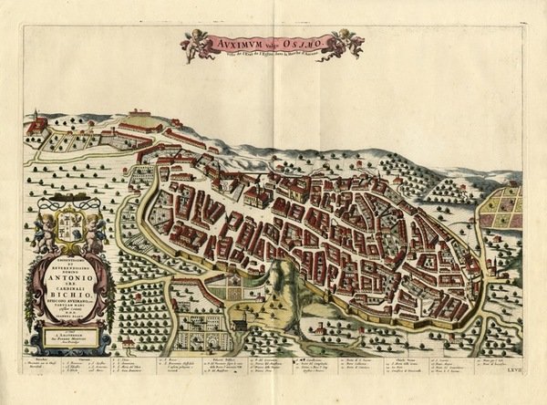 OSIMO - MORTIER, Pierre. 1724. "Auximum vulgo Osimo". Bella veduta a volo d'uccello della città e dintorni, titolo in alto sorretto da due angioletti, in basso "dedica" ornata sormontata da stemma.
