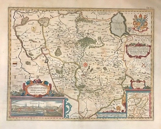 Carta geografica originale (cm. 48x37,5 più ampi margini bianchi) tratta dall’edizione in lingua latina dell’ ‘Atlas novus, sive descriptio geographica orbis terrarum’ pubblicato da Johannes Janssonius ed Henricus Hondius. Splendida coloritura d’epoca all’acquarello. Esemplare in ottimo stato di conservazione. Rara.