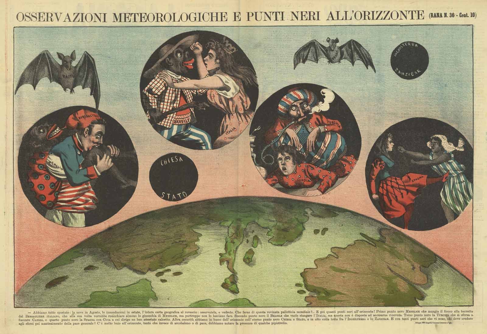 Satirica raffigurazione della situazione politica generale nel settembre del 1896 in cui viene presentato un mondo alla rovescia."c'è molto buio all'orizzonte, tanto che invece di arcobaleno o di pace, dobbiamo notare la presenza di qualche pipistrello!". I buchi neri sono la situazione che vede contrapposte Italia ed Etiopia, Turchia e Candia, Italia e Brasile, Spagna e Cuba. Piega centrale editoriale. Rara