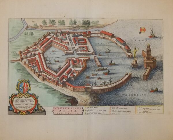 OSTIA - BLAEU, Joannes. 1163. "Utriusque Portus Ostiae delineatio." Bella veduta con stemma, dedica, titolo e didascalia lungo il margine inferiore; molti velieri nel porto