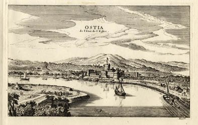 OSTIA - MORTIER, Pierre. 1724. "Ostia de l'Etat de l'Eglise". Graziosissima veduta prospettica della città , del porto, e dintorni.