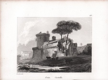 Veduta tratta dal celebre ' L'Italie, la Sicile, les Iles Éoliennes, l'Ile d'Elbe, la Sardaigne, Malte, l'Ile de Calypso etc. D'après les inspirations, les recherches et les travaux de M. M. le Vicomte de Chateaubriand, De Lamartine, Raoul-Rochette, le Comte de Forbin, Piranesi, Mazzara, et de Napoléon, Denon, Saint-Non, Lord Byron, Goethe, Visconti, Cicognara, Lanzi, de Bonstetten, Swinburne, etc. Sites, Monumens, Scènes et Costumes, d'après M.me Haudebourt-Lescot, MM. Horace-Vernet, Granet, Isabey, Ciceri, Mazzara, le Major Light, le Cap. Batty, Cooke, Gell et Gandy, Pinelli, Ferrari, Zucoli, et beaucoup d'autres artistes italiens. Recueillis et publiés par Audot Père, Membre de la Société de Géographie, ' edito a Parigi tra il 1834 ed il 1837 e ristampato a Torino [Giuseppe Pomba e Ca, 1834-1838]. L'opera, in cinque volumi, raccoglie scritti di autori vari, curati da Audot, ed è riccamente illustrata da 324 incisioni su acciaio fuori testo, molte delle quali con accostamento multiplo, per un totale di 473 tavole. Fu notoriamente mastodontico il lavoro cui si sottopose Louis Eustache Audot (1783-1870). View taken from the famous ' L'Italie, la Sicile, les Iles Éoliennes, l'Ile d'Elbe, la Sardaigne, Malte, l'Ile de Calypso etc. D'après les inspirations, les recherches et les travaux de M. M. le Vicomte de Chateaubriand, De Lamartine, Raoul-Rochette, le Comte de Forbin, Piranesi, Mazzara, et de Napoléon, Denon, Saint-Non, Lord Byron, Goethe, Visconti, Cicognara, Lanzi, de Bonstetten, Swinburne, etc. Sites, Monumens, Scènes et Costumes, d'après M.me Haudebourt-Lescot, MM. Horace-Vernet, Granet, Isabey, Ciceri, Mazzara, le Major Light, le Capt. Batty, Cooke, Gell et Gandy, Pinelli, Ferrari, Zucoli, et beaucoup d'autres artistes italiens. Recueillis et publiés par Audot Père, Membre de la Société de Géographie, ' published in Paris between 1834 and 1837 and reprinted in Turin [Giuseppe Pomba e Ca, 1834-1838]. The work, in five volumes, collects the writings of various authors, edited by Audot, and is richly illustrated with 324 engravings on steel outside the text, many of them with multiple combinations, for a total of 473 tables. Louis Eustache Audot (1783-1870) was a notoriously mammoth task. Cfr.