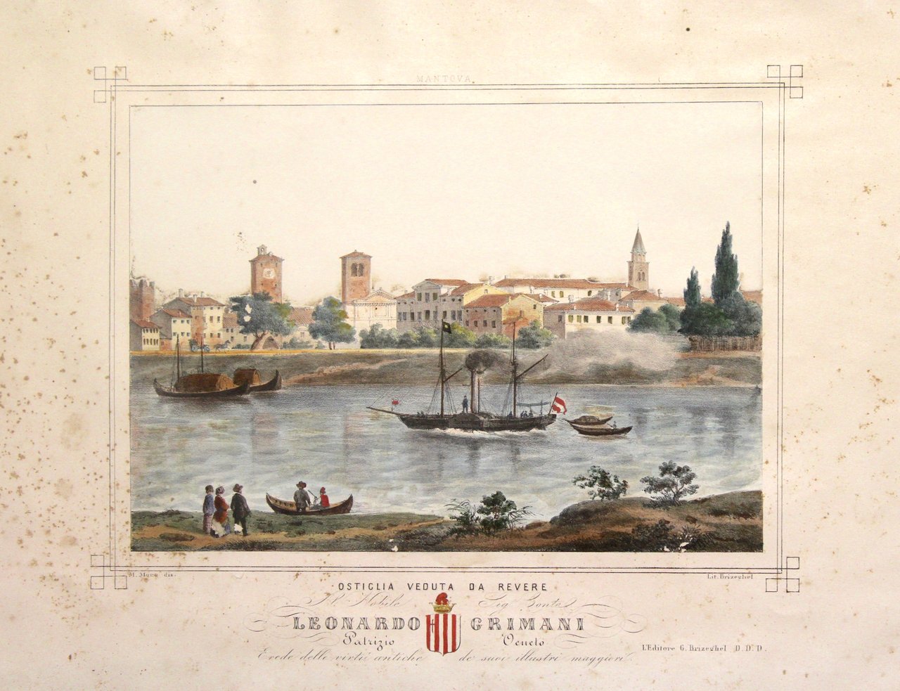 Litografia, mm 184x264 (immagine), eseguita su disegno di Moro dall'editore litografo Brizeghel. Tratta dall'opera "Mantova e la sua provincia" composta da 24 tavole rappresentanti gli scorci più caratteristici e rappresentativi della città e dintorni. Esemplare molto marginoso con bella coloritura antica. Insignificanti difetti e fioriture/ossidazione marginale.