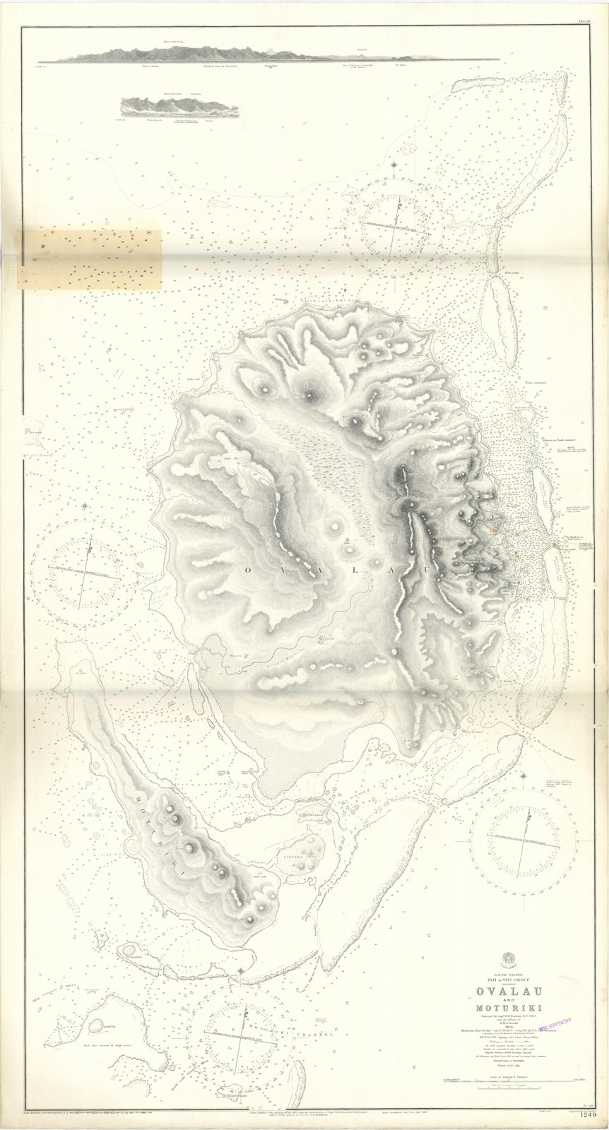 Ovalau and Moturiki Surveyed by Capt. H.M. Denham and the Officers of H.M.S. Herald 1856. London Published at the Admiralty, 18th Dec. 1865 under the Superintendence of Capt. G.H. Richards, Hydrographer. Small corrections: 1929. Folded editorially. Autore: Admiralty Charts. Luogo: Fiji island. Anno: '900. Tecnica: incisione. Dimensioni: 1279x670 mm