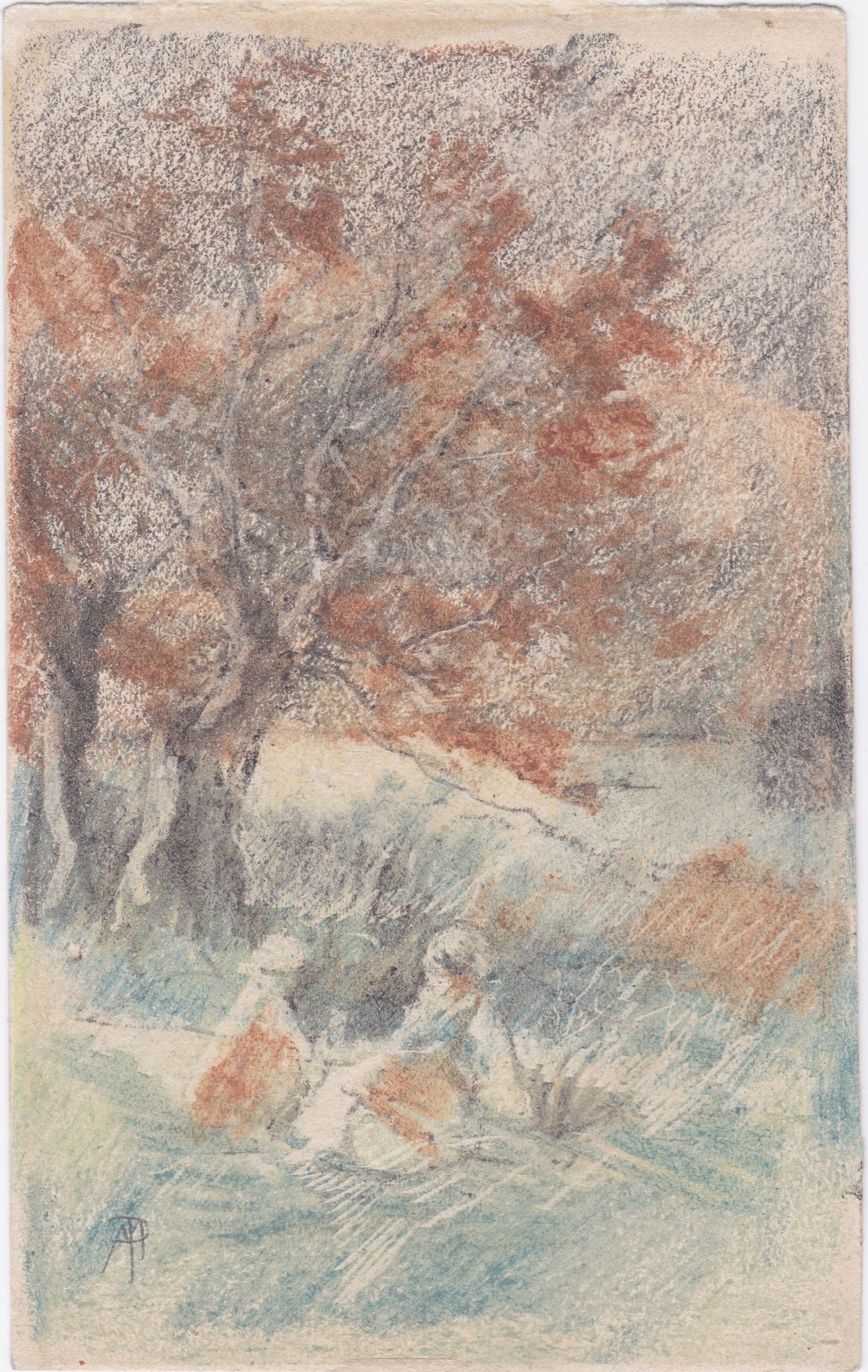 Nel foglio il piccolo paesaggio autunnale è costruito sul contrasto delle masse cromatiche. Il monotipo è stampato a colori, nei toni del ruggine e del verde smeraldo, sfruttando il colore avorio del supporto cartaceo. Mariani ha poi utilizzato una punta per asportare il colore e cercare ulteriori effetti di luce e ridefinire la struttura della composizione. Questa soluzione rimanda al linguaggio grafico ed è ricorrente nella produzione acquafortistica lombarda, riprendendo la tecnica dell'acquaforte monotipata del collega Luigi Conconi. Anche la scelta del paesaggio boscoso, le accese tinte autunnali e le luci fredde invernali si ritrovano anche nella produzione pittorica di Mariani. Monogramma a matita in basso a sinistra. Sul retro timbro tondo: Studio Pompeo Mariani. Tracce di vecchio montaggio.