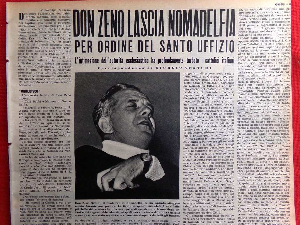 Pagina del 1952 Don Zeno lascia Nomadelfia Santo Uffizio Grock Adriano Wettach