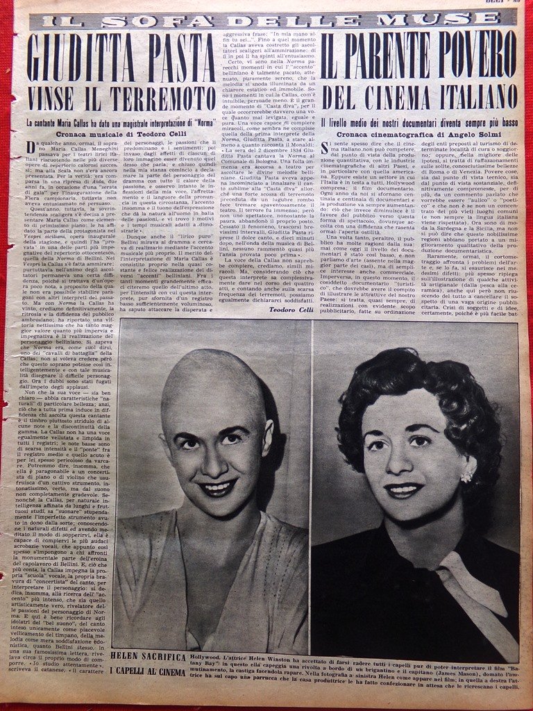 Pagina del 1952 Helen Winston Giuditta Pasta Callas Eva Magni Renzo Ricci Odeon