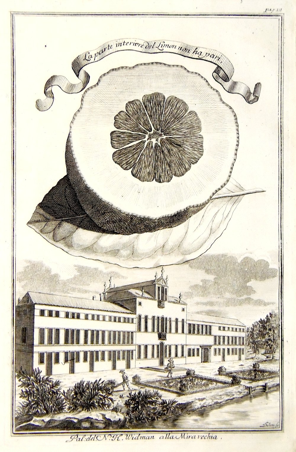 Incisione in rame di Dehne. mm 324x210. Raffigura “La parte interiore del Limon non ha pari”. Tratta da “Continuation der Nürnbergischen Hesperidum.”. L’opera è illustrata da un apparato iconografico di ricercata bellezza: incisioni raffiguranti agrumi nella parte superiore, mentre in basso vi sono raffigurazioni di palazzi, giardini, labirinti ed altro, che si possono considerare dei capolavori dell’arte botanica, fra cui citiamo: la Malcontenta, villa Pisani, palazzo Foscarini a Stra e numerosissimi altri palazzi che si incontrano lungo il Brenta e nella padovana ed in provincia di Verona con vedute di Quinzano, Parona, Settimo di Pescantina, Chievo; all’inizio le grandi tavole raffiguranti giardini fra cui citiamo Villa Allegri (ora Arvedi) a Cuzzano presso Verona, Palazzo Morosini (Padova), Schoenbrunn, Castello di San Georghen vicino a Bayreuth, Munchausen Schwöbber (vicino a Hameln); alla fine questa edizione è arricchita da grandi tavole ripiegate di piante e frutti esotici con architetture e panorami nei loro habitat. Volckamer (1644 - 1720) intraprendente commerciante di Norimberga con una profonda passione per la botanica, figlio di un medico e botanico dedito allo studio ed alla progettazione di giardini. Nei primi anni del 1660 visitò una moltitudine di giardini e parchi in Italia, dove nacque un suo speciale interesse per l’universo degli agrumi. Passione che coltivò, attraverso la collezione di piante, dopo il ritorno nella terra natia, costruendo il proprio giardino, dove colto da ispirazione crea numerosi schizzi che poi andranno a comporre la sua opera fondamentale in due libri. E’ nel 1708 che da alle stampe il libro Nürbergisches Hesperides oder gründliche Beschreibung der edlen Citronat, Citronen - und Pomeranzen - Früchte. di evidente derivazione dalle Hesperides di Giovanni Battista Ferrari, opera che celebra gli agrumi (Hesperides, sive, De malorum aureorum cultura). Volckamer coniuga suggestioni mitologiche e ricerca scientifica in un opera letteraria, di grande fascino, dove i doni della natura si intrecciano a paesaggi e architetture di ville del nord est italiano, luoghi con i quali l'autore intratteneva i suoi contatti d'affari. Blunt: "delightful views of the gardens and palaces of Germany, Austria and Italy"; Ottimo esemplare.