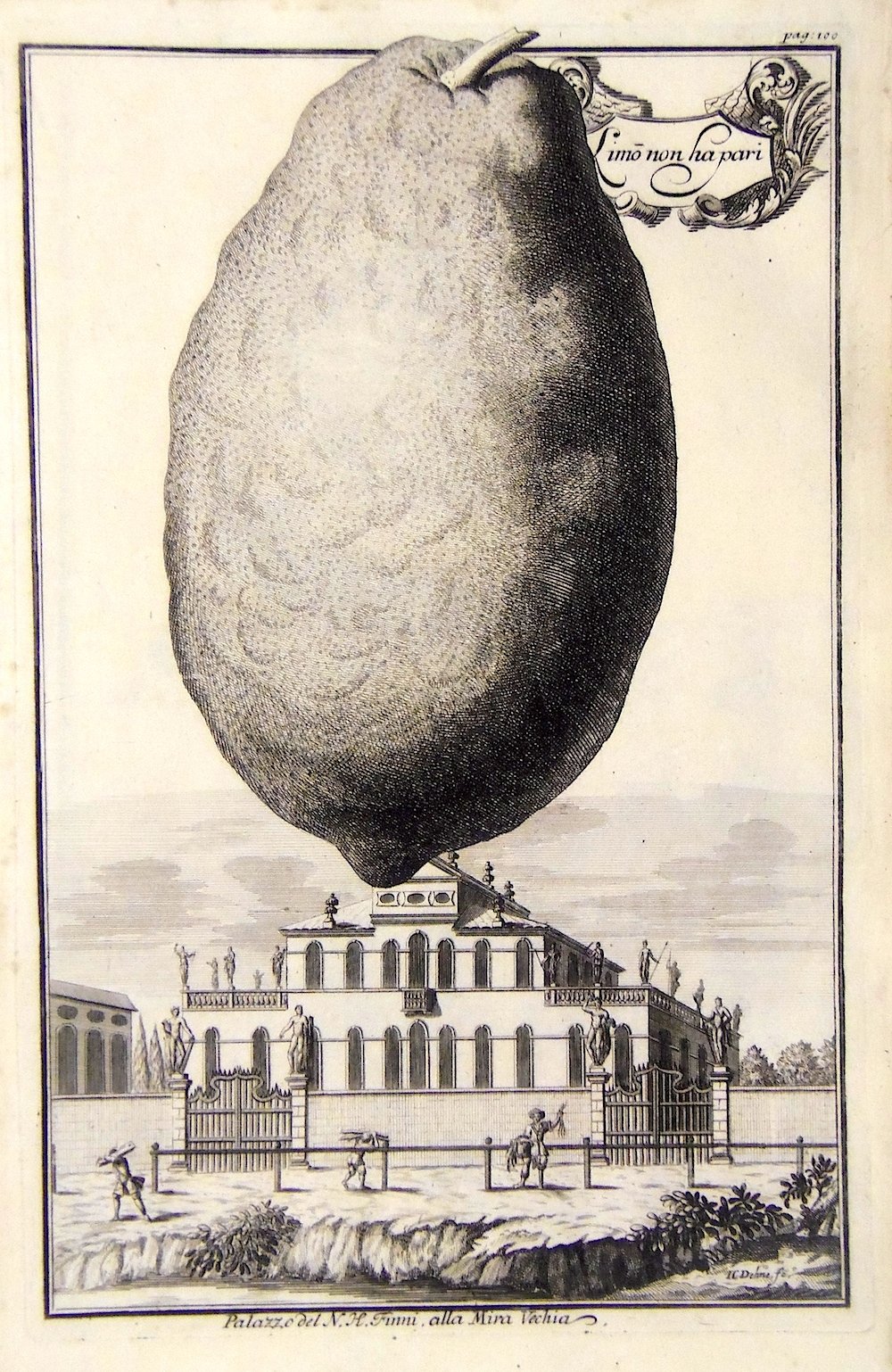 Incisione in rame di I.C.Dehne. mm 324x210. Raffigura “Limo non ha pari”. Tratta da “Continuation der Nürnbergischen Hesperidum.”. L’opera è illustrata da un apparato iconografico di ricercata bellezza: incisioni raffiguranti agrumi nella parte superiore, mentre in basso vi sono raffigurazioni di palazzi, giardini, labirinti ed altro, che si possono considerare dei capolavori dell’arte botanica, fra cui citiamo: la Malcontenta, villa Pisani, palazzo Foscarini a Stra e numerosissimi altri palazzi che si incontrano lungo il Brenta e nella padovana ed in provincia di Verona con vedute di Quinzano, Parona, Settimo di Pescantina, Chievo; all’inizio le grandi tavole raffiguranti giardini fra cui citiamo Villa Allegri (ora Arvedi) a Cuzzano presso Verona, Palazzo Morosini (Padova), Schoenbrunn, Castello di San Georghen vicino a Bayreuth, Munchausen Schwöbber (vicino a Hameln); alla fine questa edizione è arricchita da grandi tavole ripiegate di piante e frutti esotici con architetture e panorami nei loro habitat. Volckamer (1644 - 1720) intraprendente commerciante di Norimberga con una profonda passione per la botanica, figlio di un medico e botanico dedito allo studio ed alla progettazione di giardini. Nei primi anni del 1660 visitò una moltitudine di giardini e parchi in Italia, dove nacque un suo speciale interesse per l’universo degli agrumi. Passione che coltivò, attraverso la collezione di piante, dopo il ritorno nella terra natia, costruendo il proprio giardino, dove colto da ispirazione crea numerosi schizzi che poi andranno a comporre la sua opera fondamentale in due libri. E’ nel 1708 che da alle stampe il libro Nürbergisches Hesperides oder gründliche Beschreibung der edlen Citronat, Citronen - und Pomeranzen - Früchte. di evidente derivazione dalle Hesperides di Giovanni Battista Ferrari, opera che celebra gli agrumi (Hesperides, sive, De malorum aureorum cultura). Volckamer coniuga suggestioni mitologiche e ricerca scientifica in un opera letteraria, di grande fascino, dove i doni della natura si intrecciano a paesaggi e architetture di ville del nord est italiano, luoghi con i quali l'autore intratteneva i suoi contatti d'affari. Blunt: "delightful views of the gardens and palaces of Germany, Austria and Italy"; Ottimo esemplare.