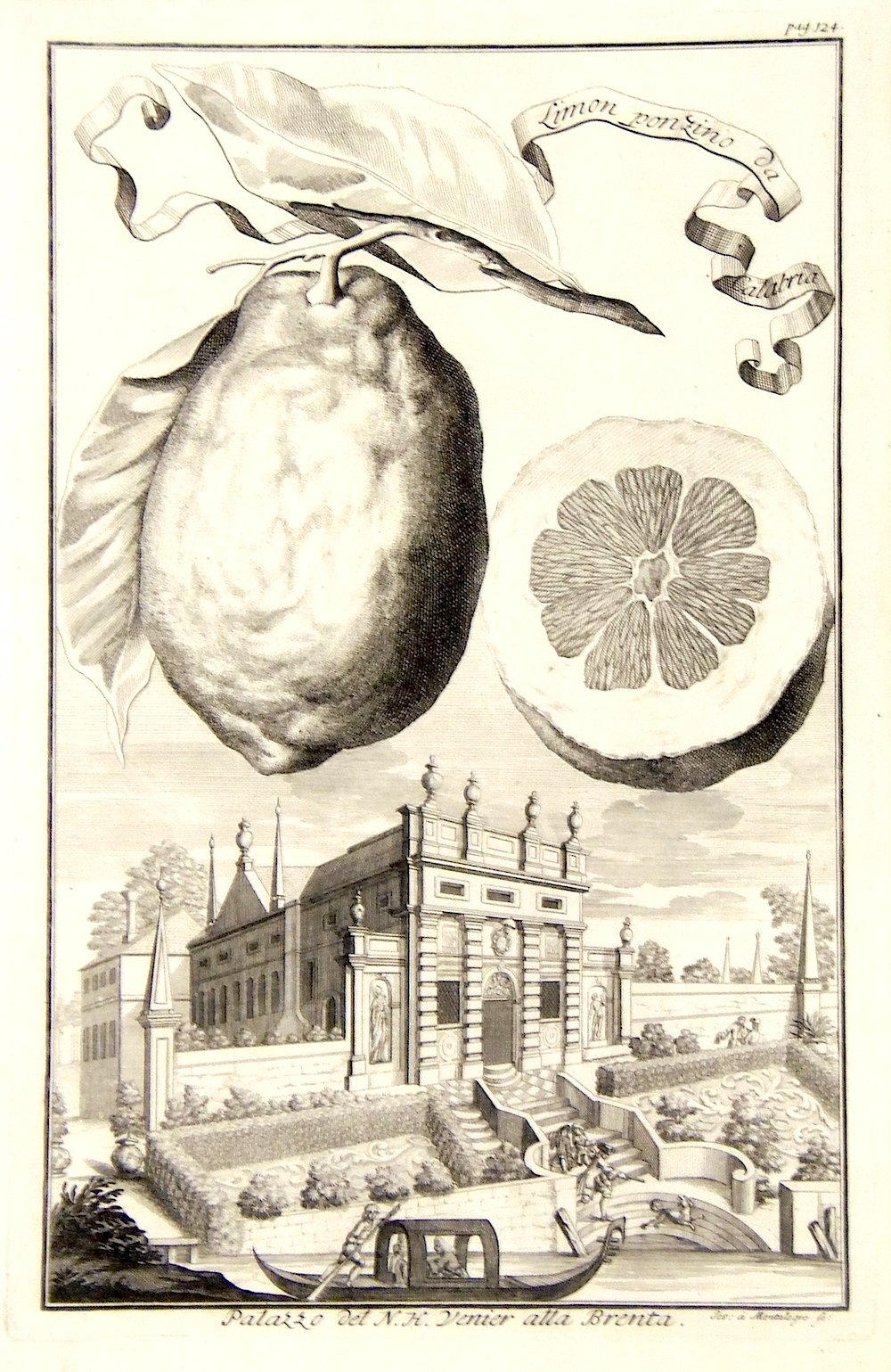 Incisione in rame di Ios a Montalegre. mm 324x210. Raffigura il “Limon ponzino da Calabria”. Tratta da “Continuation der Nürnbergischen Hesperidum.”. L’opera è illustrata da un apparato iconografico di ricercata bellezza: incisioni raffiguranti agrumi nella parte superiore, mentre in basso vi sono raffigurazioni di palazzi, giardini, labirinti ed altro, che si possono considerare dei capolavori dell’arte botanica, fra cui citiamo: la Malcontenta, villa Pisani, palazzo Foscarini a Stra e numerosissimi altri palazzi che si incontrano lungo il Brenta e nella padovana ed in provincia di Verona con vedute di Quinzano, Parona, Settimo di Pescantina, Chievo; all’inizio le grandi tavole raffiguranti giardini fra cui citiamo Villa Allegri (ora Arvedi) a Cuzzano presso Verona, Palazzo Morosini (Padova), Schoenbrunn, Castello di San Georghen vicino a Bayreuth, Munchausen Schwöbber (vicino a Hameln); alla fine questa edizione è arricchita da grandi tavole ripiegate di piante e frutti esotici con architetture e panorami nei loro habitat. Volckamer (1644 - 1720) intraprendente commerciante di Norimberga con una profonda passione per la botanica, figlio di un medico e botanico dedito allo studio ed alla progettazione di giardini. Nei primi anni del 1660 visitò una moltitudine di giardini e parchi in Italia, dove nacque un suo speciale interesse per l’universo degli agrumi. Passione che coltivò, attraverso la collezione di piante, dopo il ritorno nella terra natia, costruendo il proprio giardino, dove colto da ispirazione crea numerosi schizzi che poi andranno a comporre la sua opera fondamentale in due libri. E’ nel 1708 che da alle stampe il libro Nürbergisches Hesperides oder gründliche Beschreibung der edlen Citronat, Citronen - und Pomeranzen - Früchte. di evidente derivazione dalle Hesperides di Giovanni Battista Ferrari, opera che celebra gli agrumi (Hesperides, sive, De malorum aureorum cultura). Volckamer coniuga suggestioni mitologiche e ricerca scientifica in un opera letteraria, di grande fascino, dove i doni della natura si intrecciano a paesaggi e architetture di ville del nord est italiano, luoghi con i quali l'autore intratteneva i suoi contatti d'affari. Blunt: "delightful views of the gardens and palaces of Germany, Austria and Italy"; Ottimo esemplare.