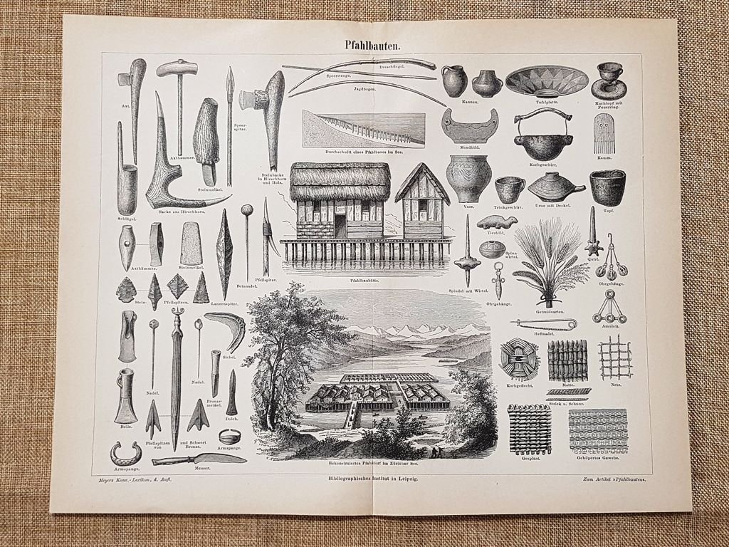 Palafitte Invenzione Tavola del 1890 Rara tavola estratta da pubblicazione del 1890  Stampata su carta non retroscritta Palafitte  Dimensioni: Cm 29,00 x 23,00 Codice prodotto: GEO-141