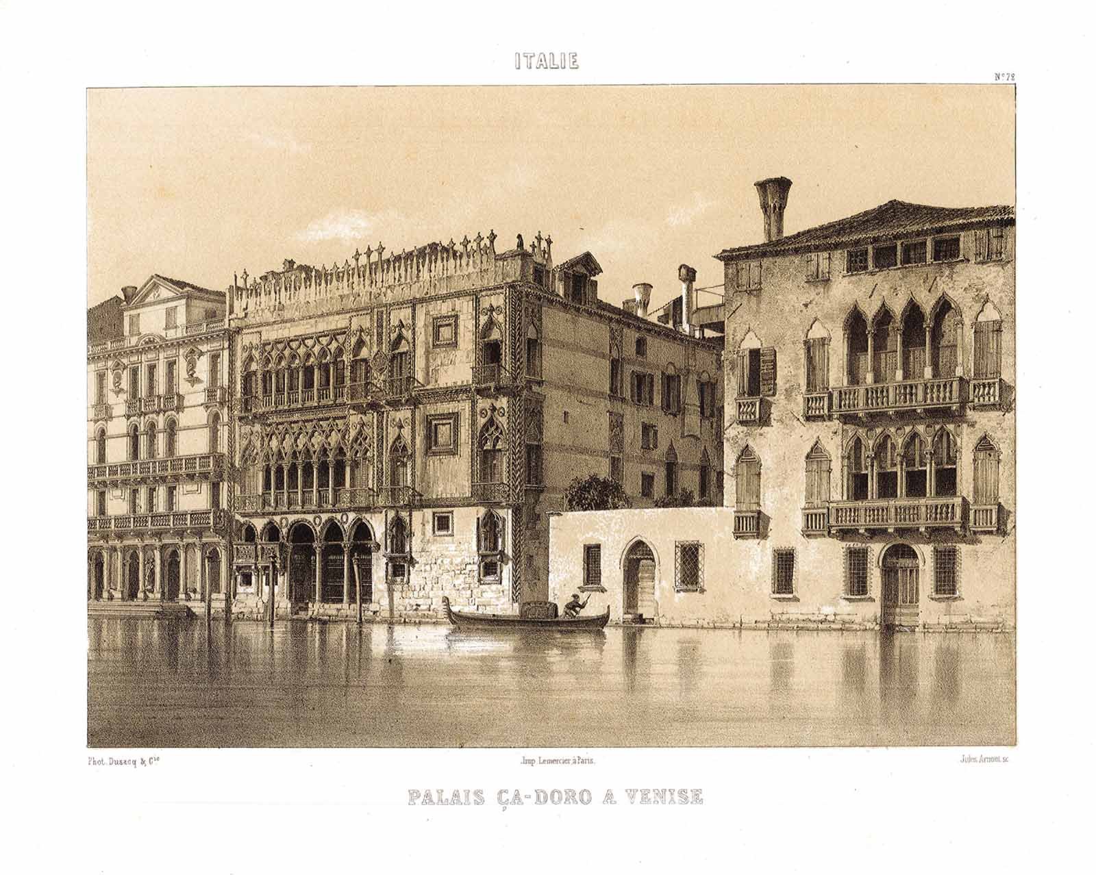 Stampa, antica ed originale, con veduta del Palazzo Ca' d'Oro. Inserita nell'opera "Excursions photographiques. Vues et monuments les plus remarquables de l'univers.". Parigi 1863. Autore: Arnout Jukes. Luogo: Venezia. Anno: 1863. Tecnica: litografia. Dimensioni: 270x370 il foglio.