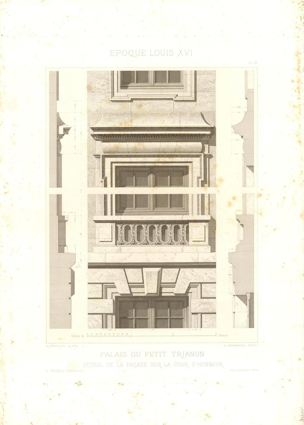 Incisione, antica ed originale, riproducente architetture all'Epoque de Louis XVI re di Francia dal 1774 al 1792. Autore: Pfnor M. Rodolphe delineò & diresse. Luogo: Versailles - Palais du Petit Trianon. Anno: 1865. Tecnica: incisione su lastra di rame. Dimensioni: 360x510 mm il foglio.