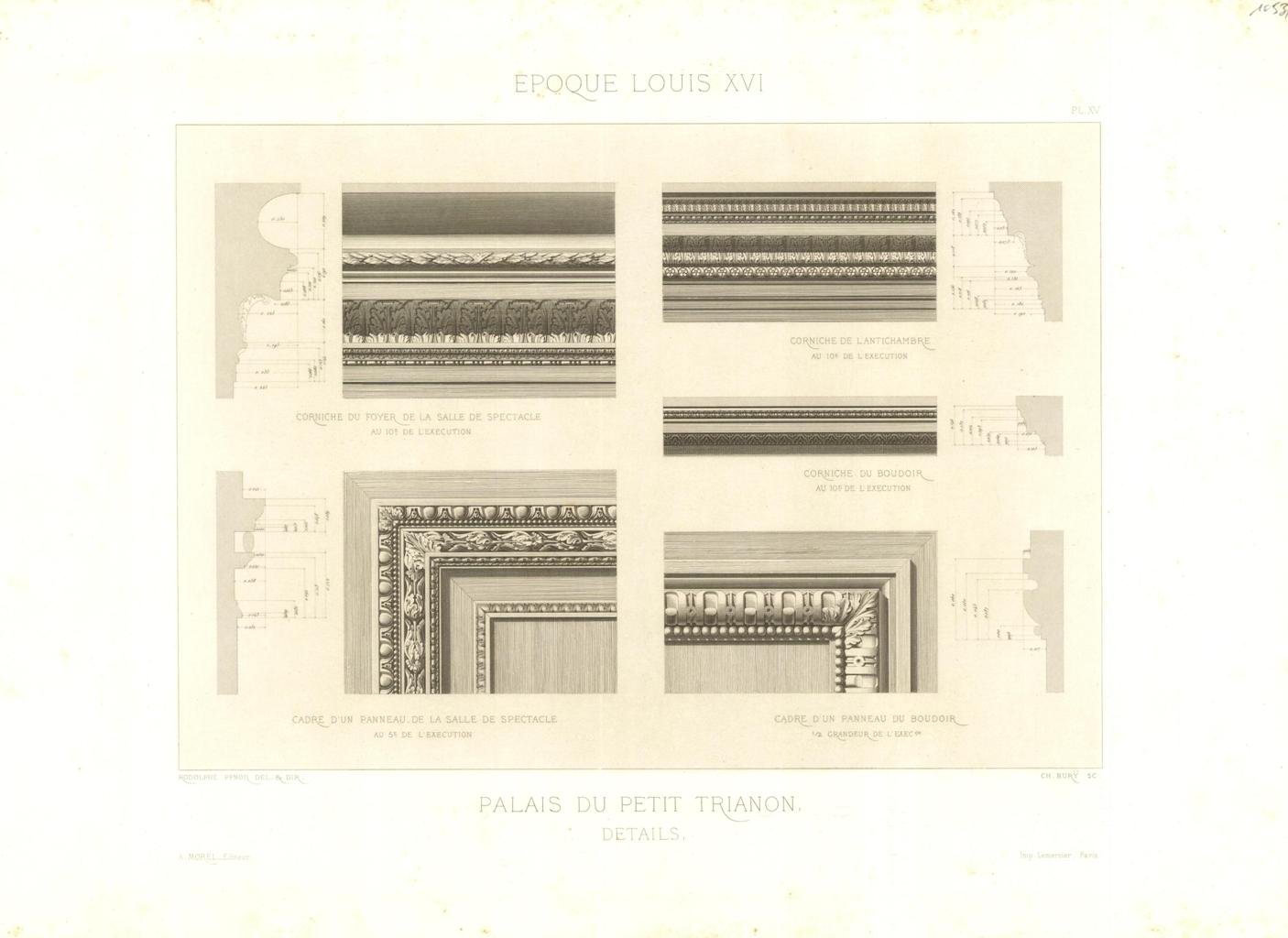 Incisione, antica ed originale, riproducente architetture all'Epoque de Louis XVI re di Francia dal 1774 al 1792. Autore: Pfnor M. Rodolphe delineò & diresse. Luogo: Versailles - Palais du Petit Trianon. Anno: 1865. Tecnica: incisione su lastra di rame. Dimensioni: 360x510 mm il foglio.