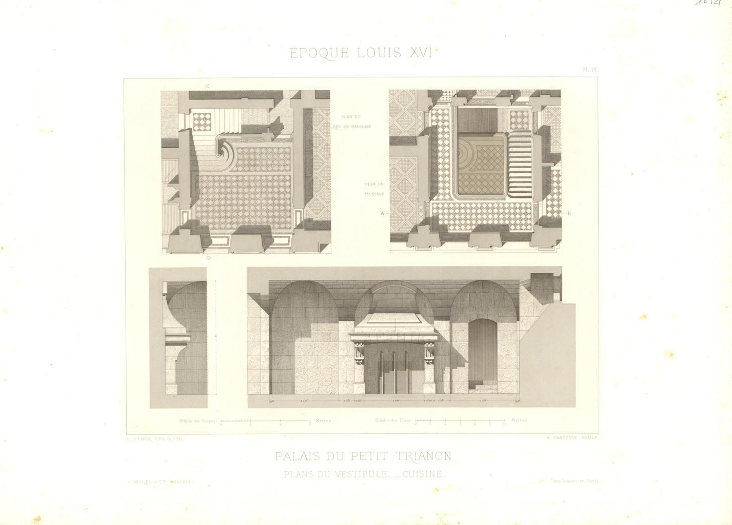 Incisione, antica ed originale, riproducente architetture all'Epoque de Louis XVI re di Francia dal 1774 al 1792. Autore: Pfnor M. Rodolphe delineò & diresse. Luogo: Versailles - Palais du Petit Trianon. Anno: 1865. Tecnica: incisione su lastra di rame. Dimensioni: 360x510 mm il foglio.