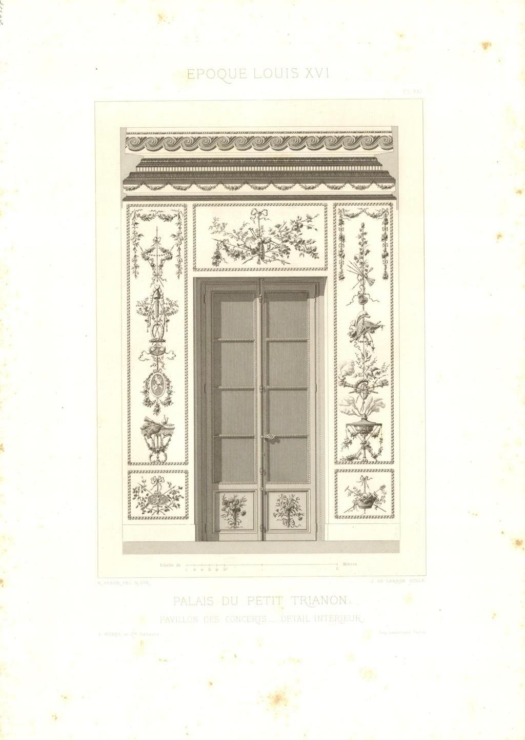 Incisione, antica ed originale, riproducente architetture all'Epoque de Louis XVI re di Francia dal 1774 al 1792. Autore: Pfnor M. Rodolphe delineò & diresse. Luogo: Versailles - Palais du Petit Trianon. Anno: 1865. Tecnica: incisione su lastra di rame. Dimensioni: 360x510 mm il foglio.