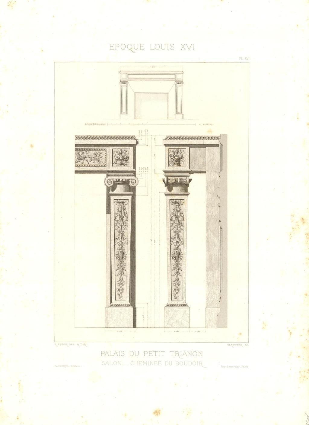 Incisione, antica ed originale, riproducente architetture all'Epoque de Louis XVI re di Francia dal 1774 al 1792. Autore: Pfnor M. Rodolphe delineò & diresse. Luogo: Versailles - Palais du Petit Trianon. Anno: 1865. Tecnica: incisione su lastra di rame. Dimensioni: 360x510 mm il foglio.