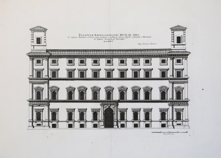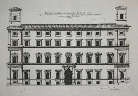 Palazzo Sora, conosciuto anche come Palazzo Fieschi Sora, è un palazzo rinascimentale che si trova a Roma in Corso Vittorio Emanuele II, nel rione Parione, e che su corso Vittorio occupa tutto l'isolato tra via Sora e vicolo Savelli. Opera tratta dalla celebre ' Academia Todesca della Architectura, Scultura & Pittura: oder Teutsche Academie der Edlen Bau, Bild-und Mahlerey-Künste, ' raccolta monumentale, riccamente illustrata da centinaia di incisioni raffiguranti antichità, architettura e mitologia classica, edita a Norimberga e Francoforte tra il 1675 ed il 1680. La serie ' Palazzi di Roma […] ' deriva dalle incisioni realizzate da Giovan Battista Falda per l'architetto Pietro Ferrerio. ' Per le incisioni, Sandrart si avvalse dei suoi collaboratori Hans Ulrich Frank, Johannes Meyer, Richard Collin, Suzanne Marie von Sandrart ed altri ancora. Incisione in rame, pieni margini, in ottimo stato di conservazione. Plate taken fom the monumental ' Academia Todesca della Architectura, Scultura & Pittura: oder Teutsche Academie der Edlen Bau, Bild-und Mahlerey-Künste ' (Deutsche Academy of Architecture - Sculpture – Painting). ' Sandrart's work are inspired by the series ' Palazzi di Roma […] ' by Pietro Ferrerio. This series of etchings is divided into two books showing the plans and architecture of various buildings in Rome. The two books were published in Rome by Gian Giacomo de Rossi, in 1655 circa. ' The first volume, titled ' Palazzi di Roma de' più celebri architetti designati da Pietro Ferrerio pittore et architetto, contains 44 etching, all except one identifying Pietro Ferrerio as draftsman. The second book, ' Nuovi disegni dell'architettura e piante de'palazzi de Roma de'piu celebri architetti, disegnati et intagliati da Gio. ' Battista Falda, contains 61 etchings by Giovanni Battista Falda. The first edition, in German, was published by Joachim von Sandrart in Nuremberg, in three volumes respectively in 1675, 1679 and 1680. For the plates Sandrart used his students as and many others artist as Karl Gustav von Amling (1650-1703); Philip Kilian (1628-1693); Richard Collin (1627-97); Georg Andreas Wolfgang (1631-1716); Johann Georg Waldreich (d.1680); Melchior Küsel (1626-1683); Franck, Johann (fl.1659-1690); George Christoph Eimmart (1638-1705); Susanna Maria von Sandrart (1658-1716); Bartholomäus Kilian (1630-1696). The work is full of illustrations of ancient and modern Roman buildings, sculpture, the theory of painting, biographies of artists, including German and contemporary (ie seventeenth-century) artists, and antiquities. Joachim von Sandrart was a painter of some note but it is for his Teutsche Academie that he is chiefly remembered. His compendious treatise includes sections on ancient sculpture and architecture, perspective, the theory of painting, artists’ biographies, a translation of Ovid’s Metamorphoses and so on. The second part of Book I purports to give a history of art from its earliest origins, and opens with an engraving of two scenes of legendary accounts of the discovery of drawing. The frontispiece to Volume I is signed as drawn by J. de Sandrart and engraved by C.G. Amling; that of Volume II is signed as drawn by Sandrart and engraved by R. Collin. The portrait in Volume I is signed as painted by J.U. Mair and engraved by P. Kilian; that in Volume II is signed as engraved by R. Collin. Many plates are signed as drawn by Sandrart and engraved by R. Collin or other engravers (J. Franck, G.A. Wolfgang, J.G. Waldreich, I.I. Thourneyser, Melchior Küsell, G. C. Eimmart, B. Kilian, Jacob Sandrart, Joh. Meyer, Susanna von Sandrart, J.A. Boener, C. Meyer). Many plates are unsigned. The work is dedicated to the world-renowned German nation and to champions and lovers of art ('Der Welt-berühmten Teutschen Nation . Kunst-Helden und Kunstliebenden'). Etching with margins, very good condition. References National Gallery (Washington), ' Mark J. Millard, III (1998), no. 111; F.W. H. Hollstein, ' German engravings . ca. 1400-1700 ' (1954-), 38-41; Anna Schreurs, ' Unter Minerva schutz: bildung durch kunst in Joachim von Sandrarts 'Teutscher Academie' ' (2012). Cfr.