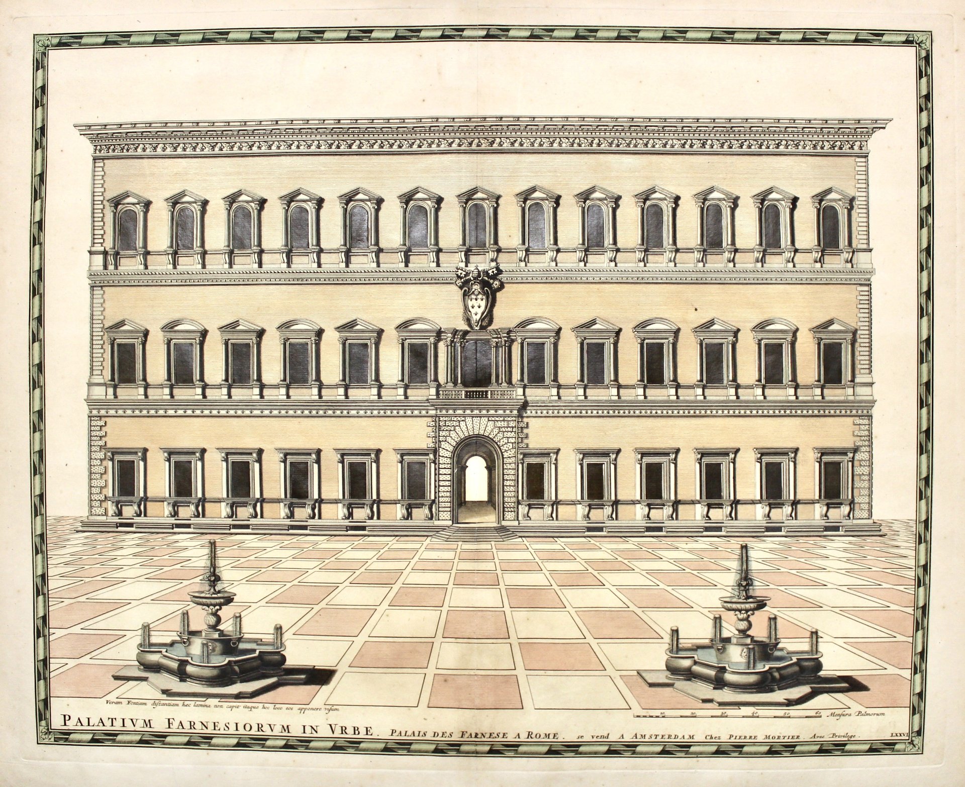 Incisione in rame, mm 454x562. Splendida incisione Raffigurante palazzo farnese a Roma dell’ architetto Barozzi da Vignola Tratta da “Nouveau théâtre d’Italie”. Pierre Mortier (1661-1711) fu un editore assai attivo ad Amsterdam agli inizi del XVIII secolo: tra le sue principali fatiche si annovera la ristampa del “Theatrum Civitatum…Italiae” di Blaeu con l’aggiunta originale di un quarto volume, relativo a nord Italia e Toscana. Allo stesso modo, Alberts apportò modifiche e inserì la sua impronta su molte mappe. Bell’ esemplare a colori , tracce usuali di pieghe editoriali, marginoso c’è un professionale restauro alla piega centrale