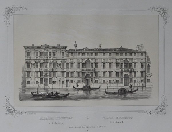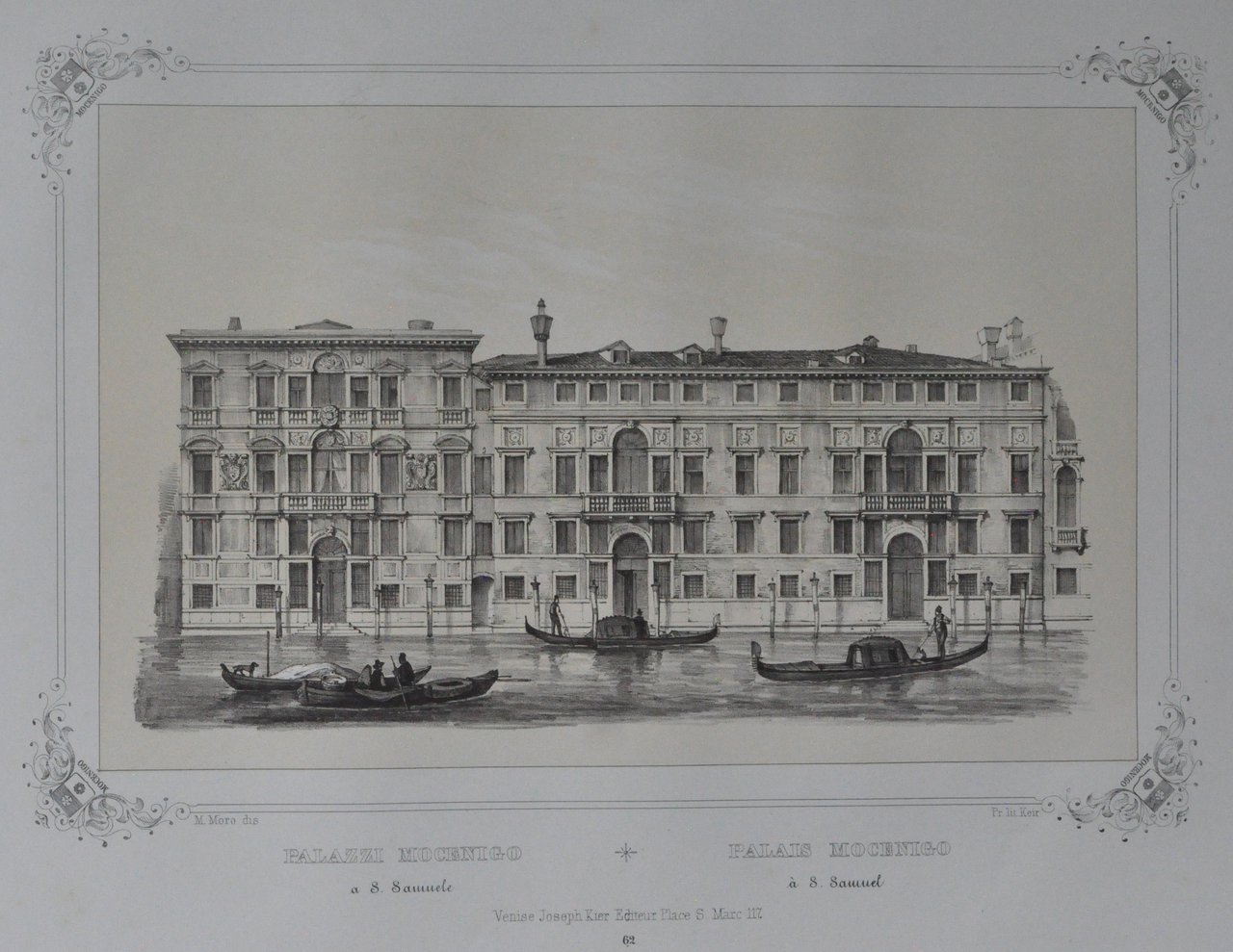 Litografia di 530 x 335 mm su carta di cellulosa. Incisione in cornice con stemmi della famiglia Mocenigo agli angoli. In basso al centro, in italiano e francese: "Palazzi Mocenigo a S. Samuele - Palais Mocenigo a S. Samuel". Più sotto "Venise, Joseph Kier Editeur, place S. Marco N° 117" Più sotto: "62". Proveniente da "Venezia monumentale e pittoresca" di Gianjacopo Fontana. Moro Marco (1817-1885): litografo, disegnatore, editore di stampe. Nato a Zenson di Piave (TV), morto a Venezia.530 x 335 mm lithograph on cellulose paper. Engraving in the frame with the Mocenigo families coats of arms at the corners. Bottom center, in Italian and French: "Palazzi Mocenigo a S. Samuele - Palais Mocenigo a S. Samuel". Below "Venise, Joseph Kier Editeur, place S. Marco N ° 117" Below: "62". Coming from "Monumental and picturesque Venice" by Gianjacopo Fontana. Moro Marco (1817-1885): lithographer, draftsman, print publisher. Born in Zenson di Piave (TV), died in Venice.
