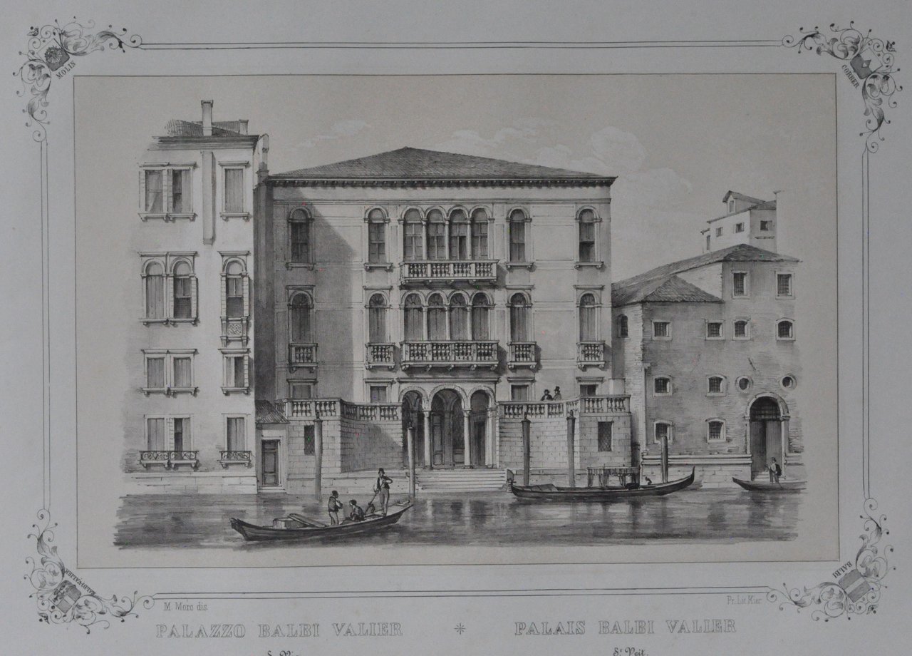 Litografia di 530 x 335 mm su carta di cellulosa. Incisione in cornice con stemmi delle famiglie Balbi, Molin, Correr e Balbi-Valier agli angoli. In basso al centro, in italiano e francese: "Palazzo Balbi Valier S.Vio - Palais Balbi Valier S. Veit". Più sotto "Venise, Joseph Kier Editeur, place S. Marco N° 117" Più sotto: "73". Proveniente da "Venezia monumentale e pittoresca" di Gianjacopo Fontana. Moro Marco (1817-1885): litografo, disegnatore, editore di stampe. Nato a Zenson di Piave (TV), morto a Venezia. 530 x 335 mm lithograph on cellulose paper. Engraving in the frame with the Balbi, Molin, Correr e Balbi-Valier families coats of arms at the corners. Bottom center, in Italian and French: "Palazzo Balbi Valier S.Vio - Palais Balbi Valier S. Veit". Below "Venise, Joseph Kier Editeur, place S. Marco N ° 117" Below: "73". Coming from "Monumental and picturesque Venice" by Gianjacopo Fontana. Moro Marco (1817-1885): lithographer, draftsman, print publisher. Born in Zenson di Piave (TV), died in Venice.