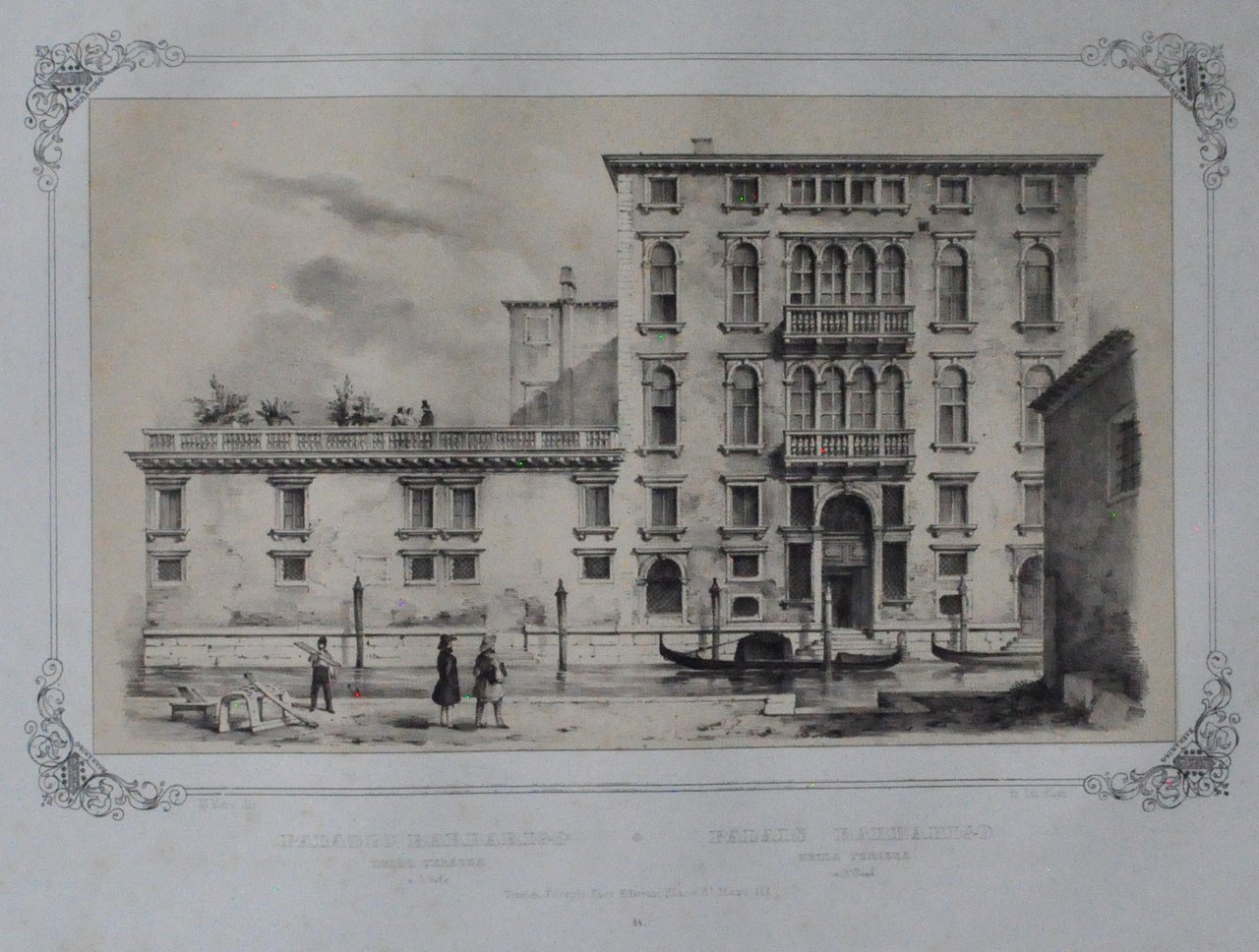 Litografia di 530 x 335 mm su carta di cellulosa. Incisione in cornice con stemmi della famiglia Barbarigo agli angoli. In basso al centro, in italiano e francese: "Palazzo Barbarigo della Terrazza a S. Polo - Palais Barbarigo della Terrazza a St Paul". Più sotto "Venise, Joseph Kier Editeur, place S. Marco N° 117" Più sotto: "44". Proveniente da "Venezia monumentale e pittoresca" di Gianjacopo Fontana. Moro Marco (1817-1885): litografo, disegnatore, editore di stampe. Nato a Zenson di Piave (TV), morto a Venezia. 530 x 335 mm lithograph on cellulose paper. Engraving in the frame with the Barbarigo family coats of arms at the corners. Bottom center, in Italian and French: "Palazzo Barbarigo della Terrazza a S. Polo - Palais Barbarigo della Terrazza a St Paul". Below "Venise, Joseph Kier Editeur, place S. Marco N ° 117" Below: "44". Coming from "Monumental and picturesque Venice" by Gianjacopo Fontana. Moro Marco (1817-1885): lithographer, draftsman, print publisher. Born in Zenson di Piave (TV), died in Venice.