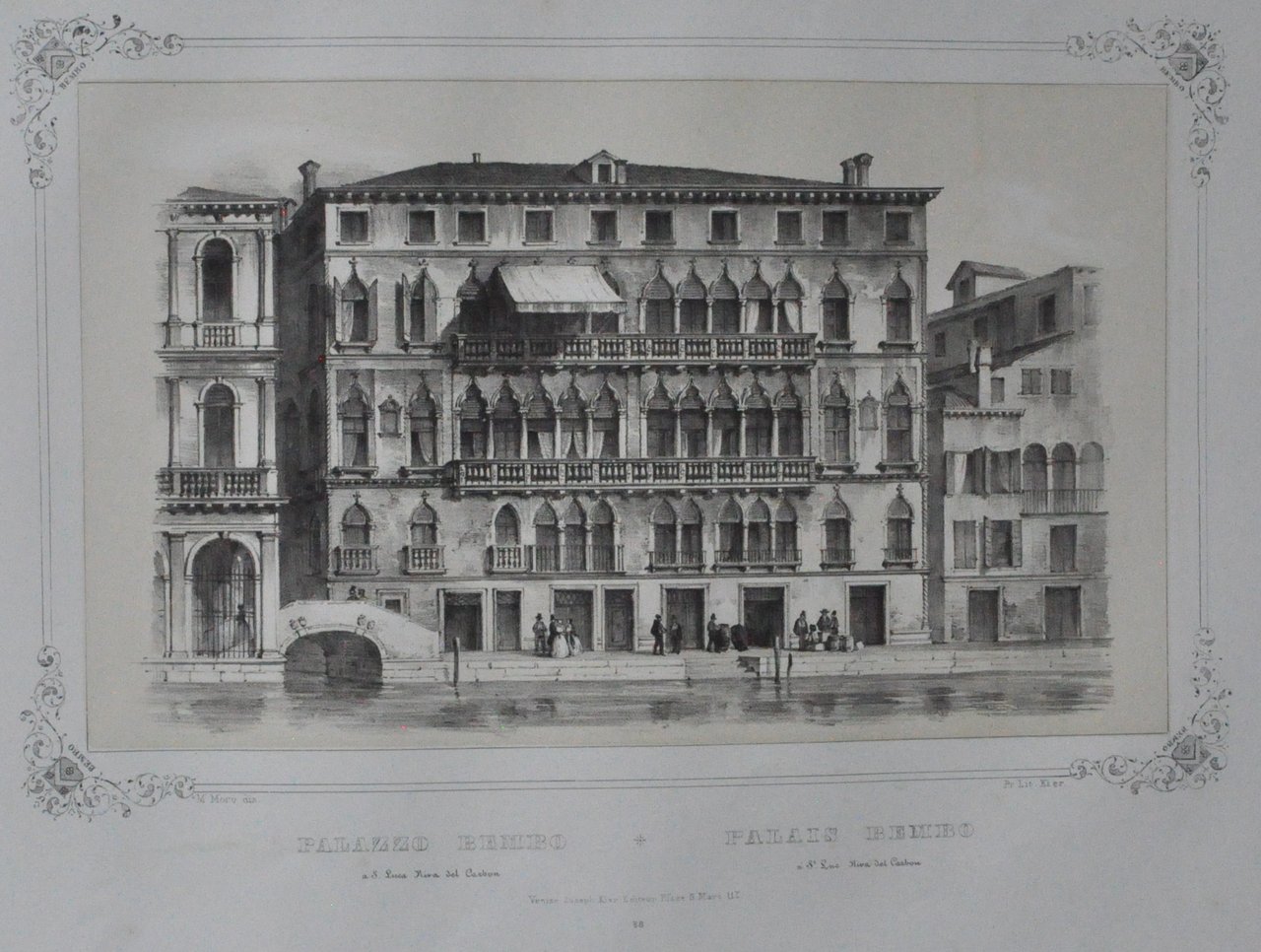 Litografia di 530 x 335 mm su carta di cellulosa. Incisione in cornice con stemmi della famiglia Bembo agli angoli. In basso al centro, in italiano e francese: "Palazzo Bembo a S. Luca Riva del Carbon - Palais Bembo à St. Luc Riva del Carbon". Più sotto "Venise, Joseph Kier Editeur, place S. Marco N° 117" Più sotto: "3". Proveniente da "Venezia monumentale e pittoresca" di Gianjacopo Fontana. Moro Marco (1817-1885): litografo, disegnatore, editore di stampe. Nato a Zenson di Piave (TV), morto a Venezia. 530 x 335 mm lithograph on cellulose paper. Engraving in the frame with the Bembo family coats of arms at the corners. Bottom center, in Italian and French: "Palazzo Trevisan Riva di Canonica - Palais Trevisan Rivo di Canonica". Below "Venise, Joseph Kier Editeur, place S. Marco N ° 117" Below: "3". Coming from "Monumental and picturesque Venice" by Gianjacopo Fontana. Moro Marco (1817-1885): lithographer, draftsman, print publisher. Born in Zenson di Piave (TV), died in Venice.