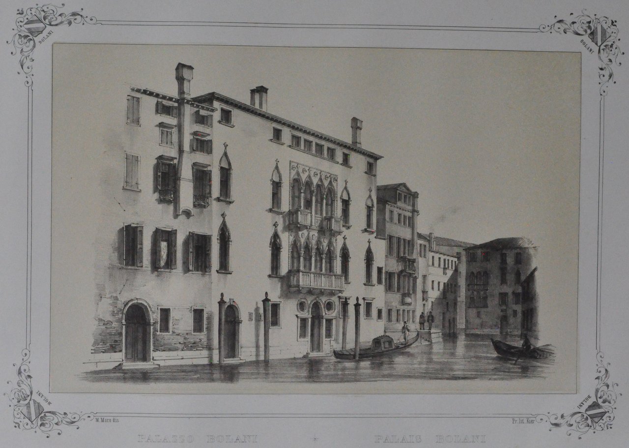 Litografia di 530 x 335 mm su carta di cellulosa. Incisione in cornice con stemmi della famiglia Bolani agli angoli. In basso al centro, in italiano e francese: "Palazzo Bolani a S. Marina - Palais Bolani a St.Marine". Più sotto "Venise, Joseph Kier Editeur, place S. Marco N° 117" Più sotto: "71". Proveniente da "Venezia monumentale e pittoresca" di Gianjacopo Fontana. Moro Marco (1817-1885): litografo, disegnatore, editore di stampe. Nato a Zenson di Piave (TV), morto a Venezia.530 x 335 mm lithograph on cellulose paper. Engraving in the frame with the Mocenigo families coats of arms at the corners. Bottom center, in Italian and French: "Palazzo Bolani a S. Marina - Palais Bolani a St.Marine". Below "Venise, Joseph Kier Editeur, place S. Marco N ° 117" Below: "71". Coming from "Monumental and picturesque Venice" by Gianjacopo Fontana. Moro Marco (1817-1885): lithographer, draftsman, print publisher. Born in Zenson di Piave (TV), died in Venice.