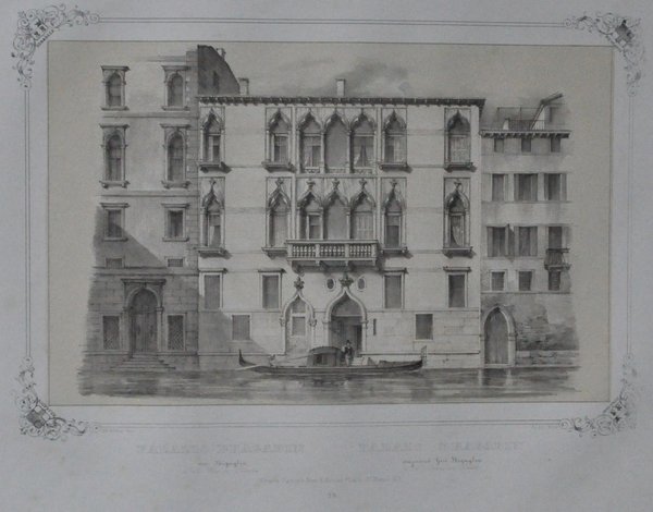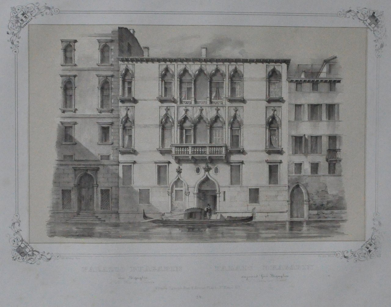 Litografia di 530 x 335 mm su carta di cellulosa. Incisione in cornice con stemmi delle famiglie Bigaglia e Bragadin agli angoli. In basso al centro, in italiano e francese: "Palazzo Bragadin ora Bigaglia a SS. Gio. e Paolo - Palazzo Bragadin aujourd'hui Bigaglia à St. Jean et Paul". Più sotto "Venise, Joseph Kier Editeur, place S. Marco N° 117" Più sotto: "52". Proveniente da "Venezia monumentale e pittoresca" di Gianjacopo Fontana. Moro Marco (1817-1885): litografo, disegnatore, editore di stampe. Nato a Zenson di Piave (TV), morto a Venezia. 530 x 335 mm lithograph on cellulose paper. Engraving in the frame with the Bigaglia and Bragadin families coats of arms at the corners. Bottom center, in Italian and French: "Palazzo Bragadin ora Bigaglia a SS. Gio. e Paolo - Palazzo Bragadin aujourd'hui Bigaglia à St. Jean et Paul". Below "Venise, Joseph Kier Editeur, place S. Marco N ° 117" Below: "52". Coming from "Monumental and picturesque Venice" by Gianjacopo Fontana. Moro Marco (1817-1885): lithographer, draftsman, print publisher. Born in Zenson di Piave (TV), died in Venice.